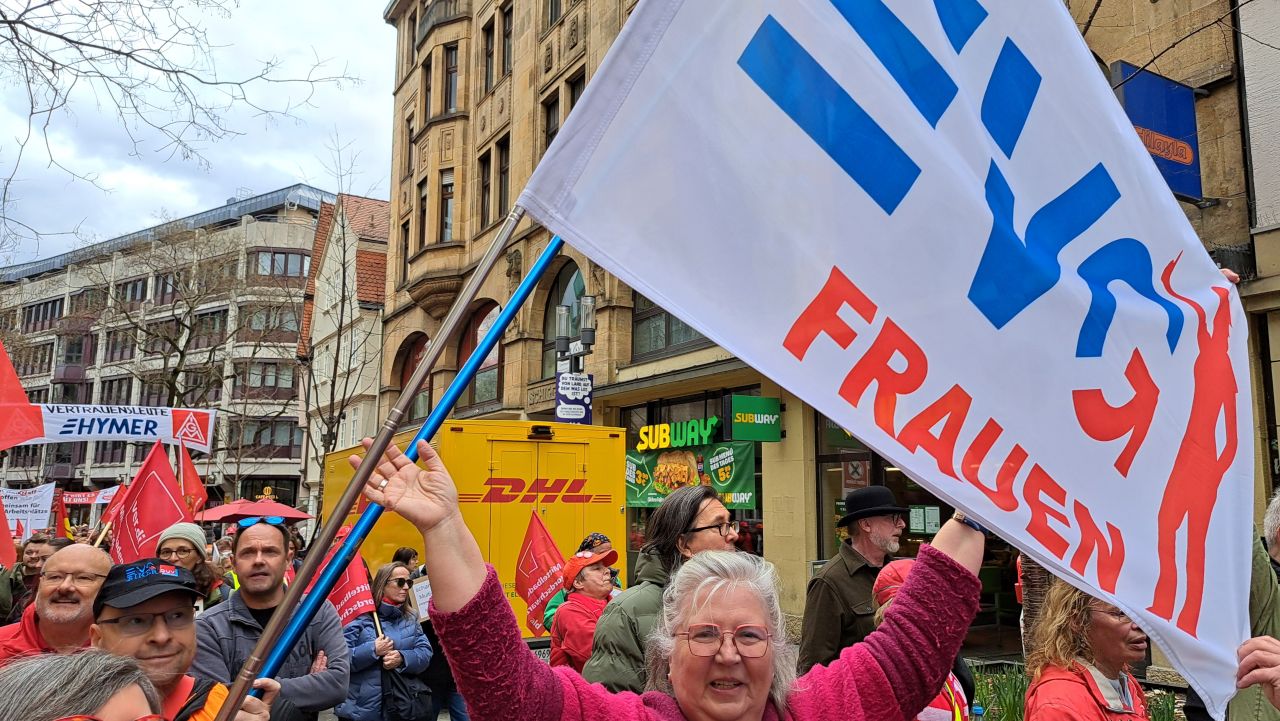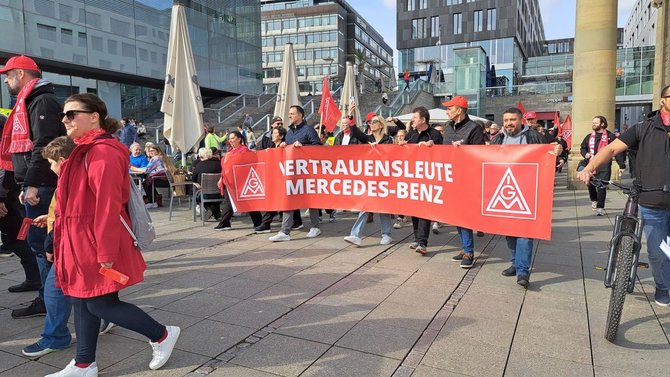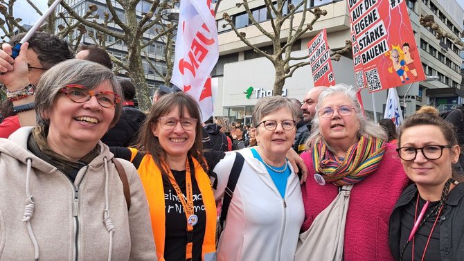 Dazu aufgerufen hatten die IG Metall, ver.di und der DGB in Baden -Württemberg. Für uns EVG-Frauen Stuttgart eine Selbstverständlichkeit, mit unseren Schwestergewerkschaften gemeinsam für gute zukunftsfähige Arbeitsplätze zu kämpfen. Gerade in Baden-Württemberg vergeht kaum eine Woche, in der nicht wieder die Hiobsbotschaft vom Abbau von Industriearbeitsplätzen die Runde macht…Ein Hohn, wenn von einigen Politiker:innen und Wirtschaftsverbänden Mehrarbeit von uns Arbeiter:innen abverlangt  und ein höheres Renteneintrittsalter gefordert wird .