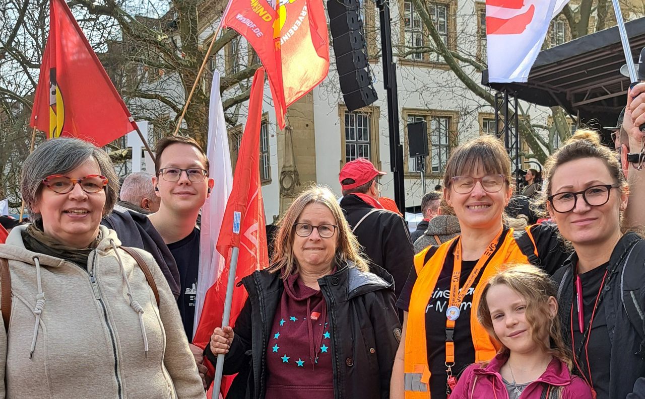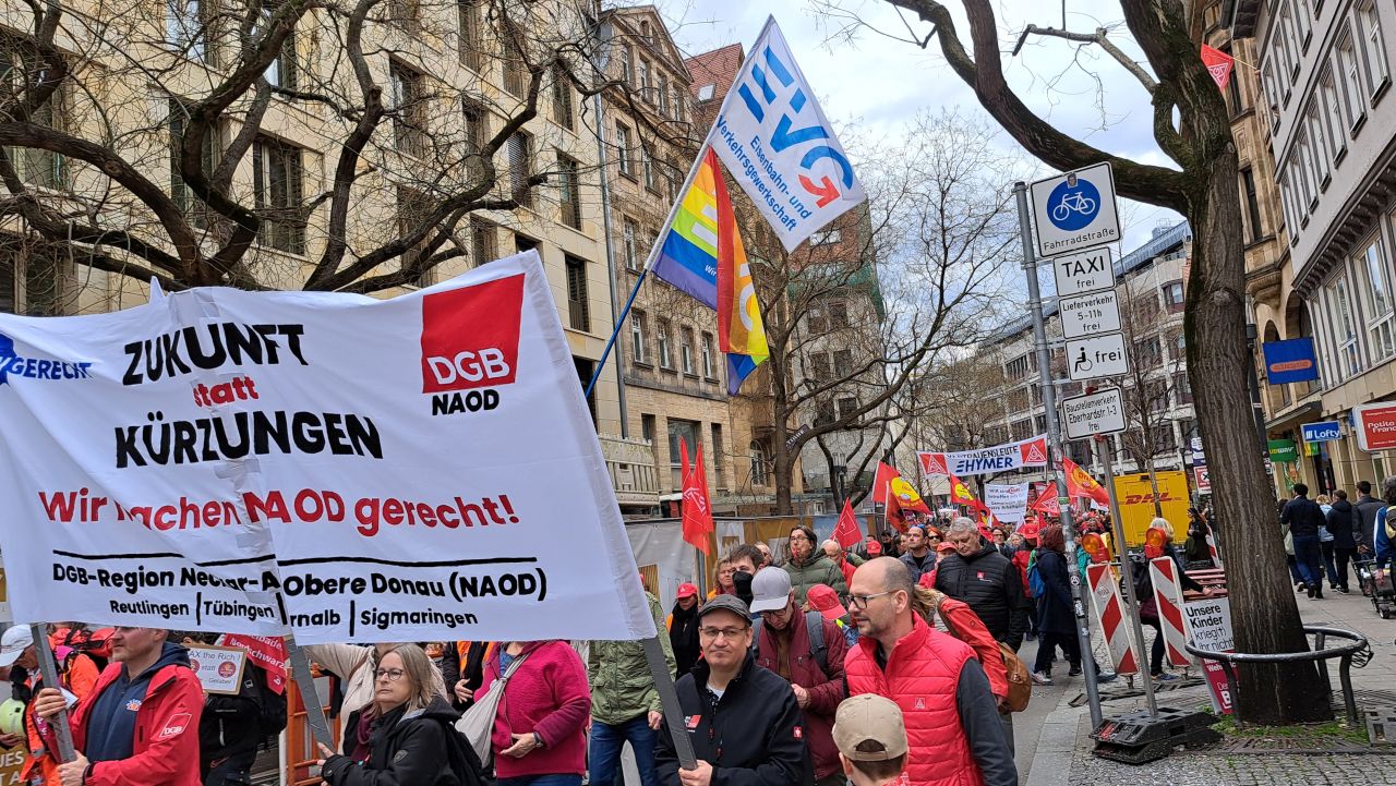 Unter dem Motto „Für unsere Arbeit. Für unsere Kommunen.“ versammelten sich am 28.Februar um 5 vor 12 rund 7.500 Gewerkschafter:innen, Familien und Sympathisant:innen auf dem Stuttgarter Schlossplatz, um für sichere Industriejobs, starke Kommunen, für mehr Investition in Infrastruktur und Bildung und für eine Stärkung der Demokratie zu demonstrieren.