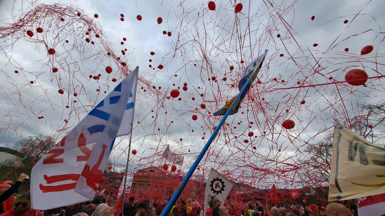 Durch die Stuttgarter Innenstadt, am Willi-Bleicher-Haus (DGB-Haus) vorbei, ging es zum Eckensee. Gegenüber vom Landtag gab es zum Abschluss eine farbenfrohe, also eher eine rote Aktion, bei der hunderte rote Luftballons und rote Papierschlangen aus Konfettikanonen in die Luft stiegen, um ein sichtbares Zeichen für Politik und Wirtschaft zu setzen… Denn Solidarität gewinnt!