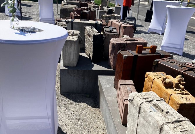 Eine Skulptur von verlassenen Gepäckstücken vor dem Würzburger Bahnhof erinnert an die deportierten Menschen. Sie stehen für die die vielen Gemeinden in der Region, in denen vor 1933 jüdische Gemeinden existierten, oder jüdische Menschen gelebt haben. Tafeln erinnern an die Geschichte der Verfolgung und der Deportationen der Juden. Viele „ganz normale“ Menschen waren aktiv und wissentlich an den Deportationen beteiligt. Andere haben weggeschaut.