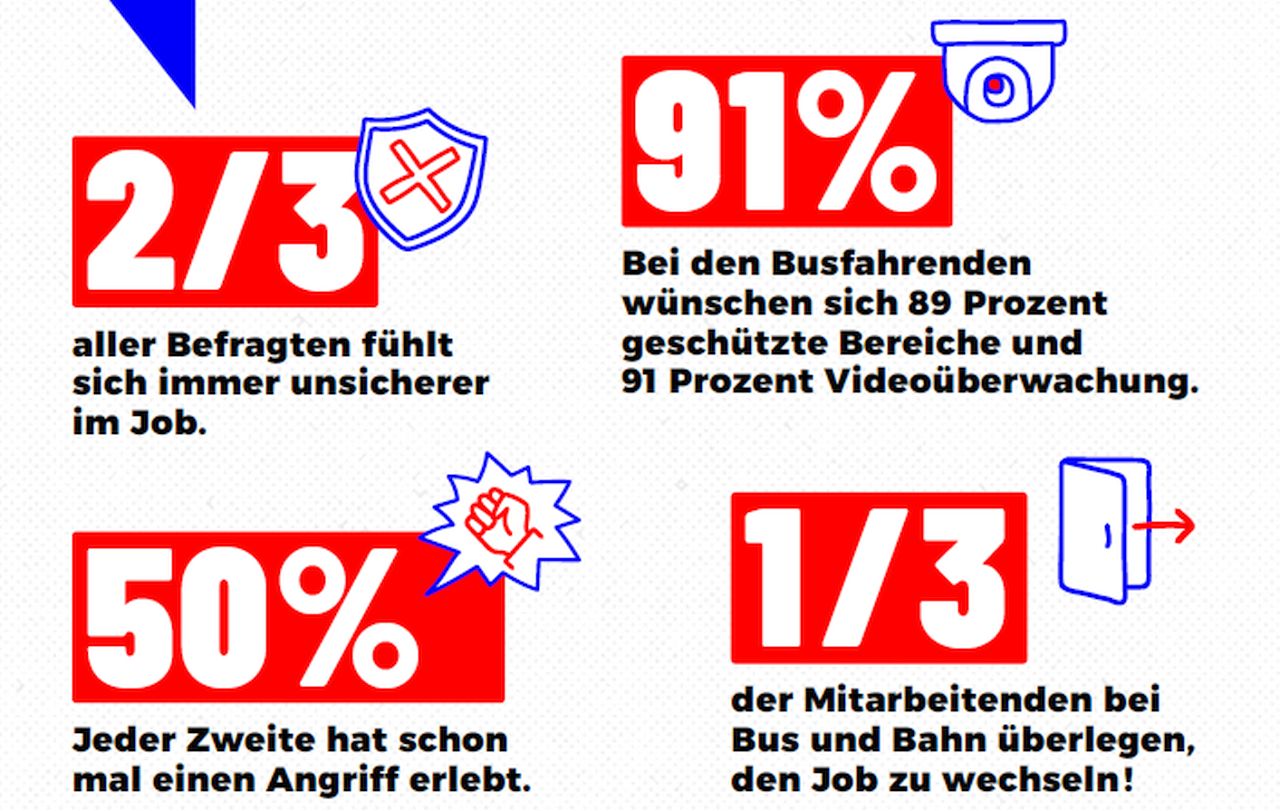 Unter den befragten Busfahrerinnen und Busfahrern, die bisher über keine der genannten Maßnahmen verfügen, wünschen sich 91 % Videoüberwachung, 89 % geschützte Bereiche und 86% Notrufoptionen. Die Sprecherin der Zentralen Fachgruppe Bus, Yvonne Liska, hatte es bei einem Treffen mit den Ministerpräsidenten der Länder Rheinland-Pfalz und Sachsen, Alexander Schweitzer und Michael Kretschmer, die derzeit den Vorsitz der Ministerpräsidentenkonferenz innehaben, deutlich gemacht: „Im Bus sind wir ganz allein, für uns gibt es keine Rückzugsmöglichkeit. Deshalb brauchen wir eine geschlossene Fahrerkabine, die uns vor Übergriffen schützt“.