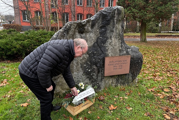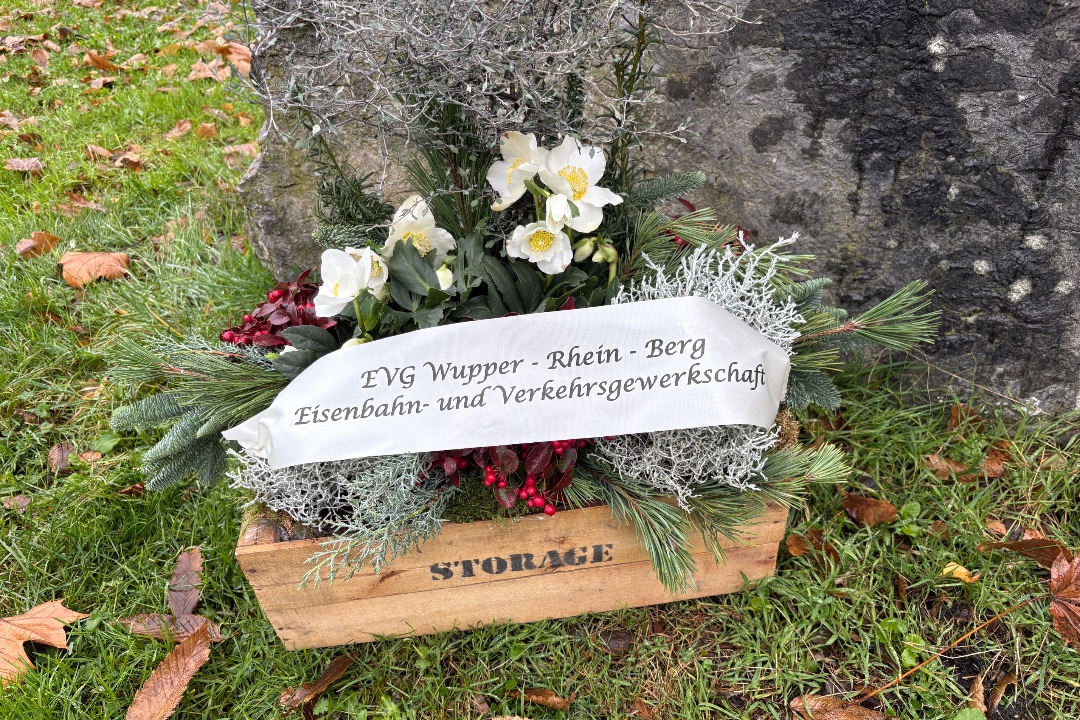Der Vorsitzende des Ortsverbandes Wupper Rhein Berg Kuno Dreschmann legte einen Pflanzkasten am Gedenkstein auf dem Gelände des ehemaligen Ausbesserungswerk Opladen nieder. Der Gedenkstein erinnert an die vielen zivilen Opfer und gefallenen Eisenbahnerinnen und Eisenbahner zum Ende des Zweiten Weltkrieges, in Opladen.