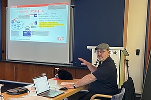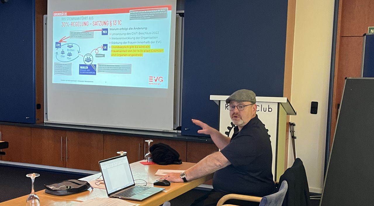 Zuvor hatte EVG-Vorstand Frank Hauenstein über den aktuellen Sachstand der geplanten Satzungsänderungen informiert, die im November auf der Bundeskonferenz beschlossen werden sollen. Dabei werden Strukturen und Gremien verschlankt. „Wir passen unsere Arbeitsgrundlage an“, so Frank. „Es geht darum, das Ehrenamt zu entlasten und mehr Zeit für die direkte Mitgliederbetreuung zu ermöglichen. Überall da, wo wir mit dem Mitglied unmittelbar in Kontakt treten, ändert sich nichts.“