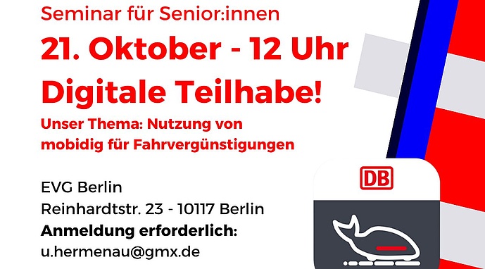 Die EVG Berlin lädt ein zum Seminar für Seniorinnen und Senioren. Unser Thema: Wie lassen sich Fahrvergünstigungen über die PC-Version von mobidig buchen.