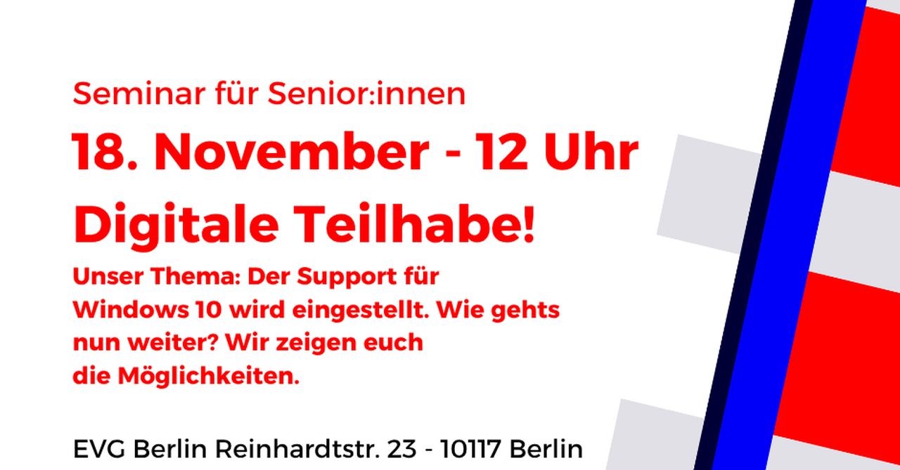 Die EVG Berlin lädt ein zum Seminar für Seniorinnen und Senioren. Unser Thema: Der Support für Windows 10 wird eingestellt. Wie gehts nun weiter? Wir zeigen euch die Möglichkeiten.