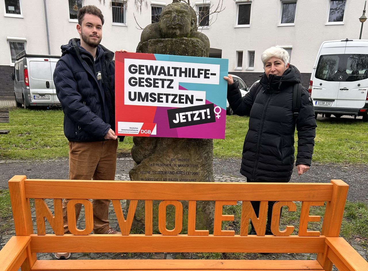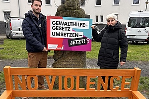 Am Hexengedenkstein in Düsseldorf-Gerresheim wurde um 11:55 Uhr symbolisch eine Bank mit dem Slogan „No Violence - keine Gewalt an Frauen und Mädchen“ aufgestellt. Begleitet wurde die Aktion von Tafeln mit klaren Forderungen: Die konsequente Umsetzung des seit Februar 2025 geltenden Gewalthilfegesetzes und der dringende Ausbau der Hilfsangebote - insbesondere die Einrichtung eines dritten Frauenhauses in Düsseldorf.