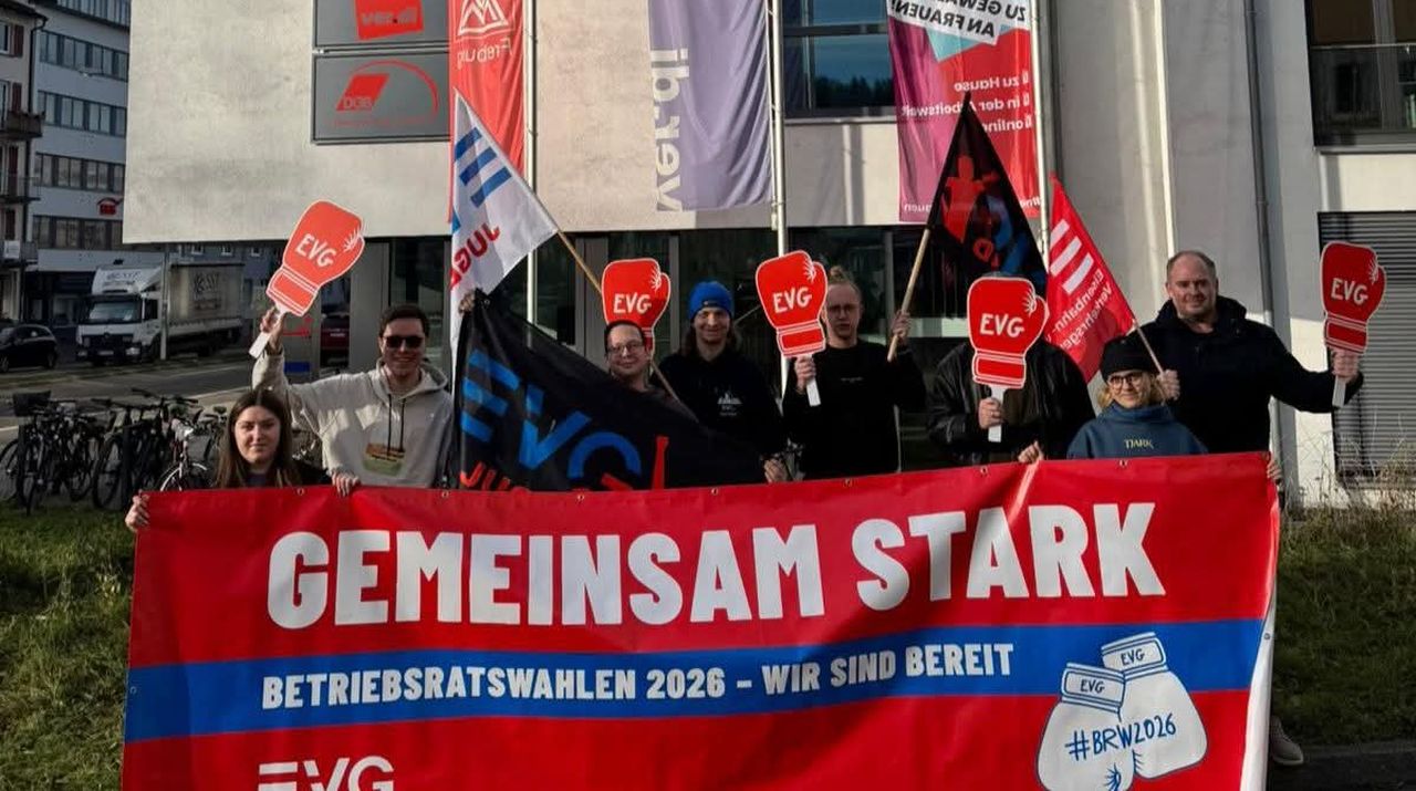 Mit einem Banner, Boxhandschuhen und Fahnen forderten sie, dass die Interessen von Auszubildenden und jungen Beschäftigten bei den Betriebsratswahlen nicht an den Rand gedrängt werden.