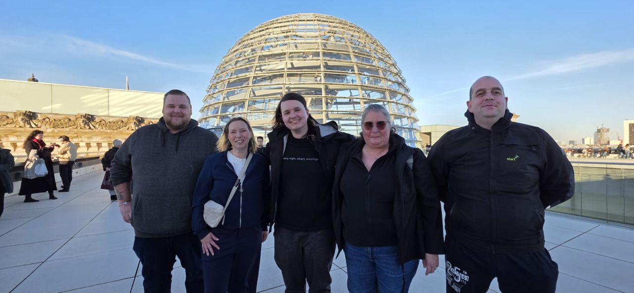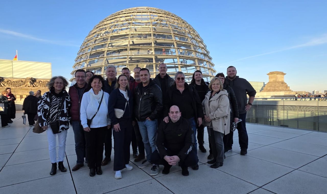 Nach dem Gespräch ging es hinauf auf die Kuppel des Reichstags – ein weiteres Highlight des Besuchs. Bei strahlendem Herbstwetter bot sich den Teilnehmenden ein beeindruckender Blick über Berlin und das Regierungsviertel aus luftiger Höhe. Am zweiten Tag standen eine politisch orientierte Stadtrundfahrt, ein Informationsgespräch in der Rosa-Luxemburg-Stiftung sowie der Besuch der Gedenkstätte Berliner Mauer auf dem Programm. In der Mittagspause wartete eine besondere Überraschung: ein Kreuzworträtsel mit Begriffen rund um den Bundestag und die EVG – eine kreative und unterhaltsame Möglichkeit, das politische Wissen mit etwas Teamgeist zu verbinden.
