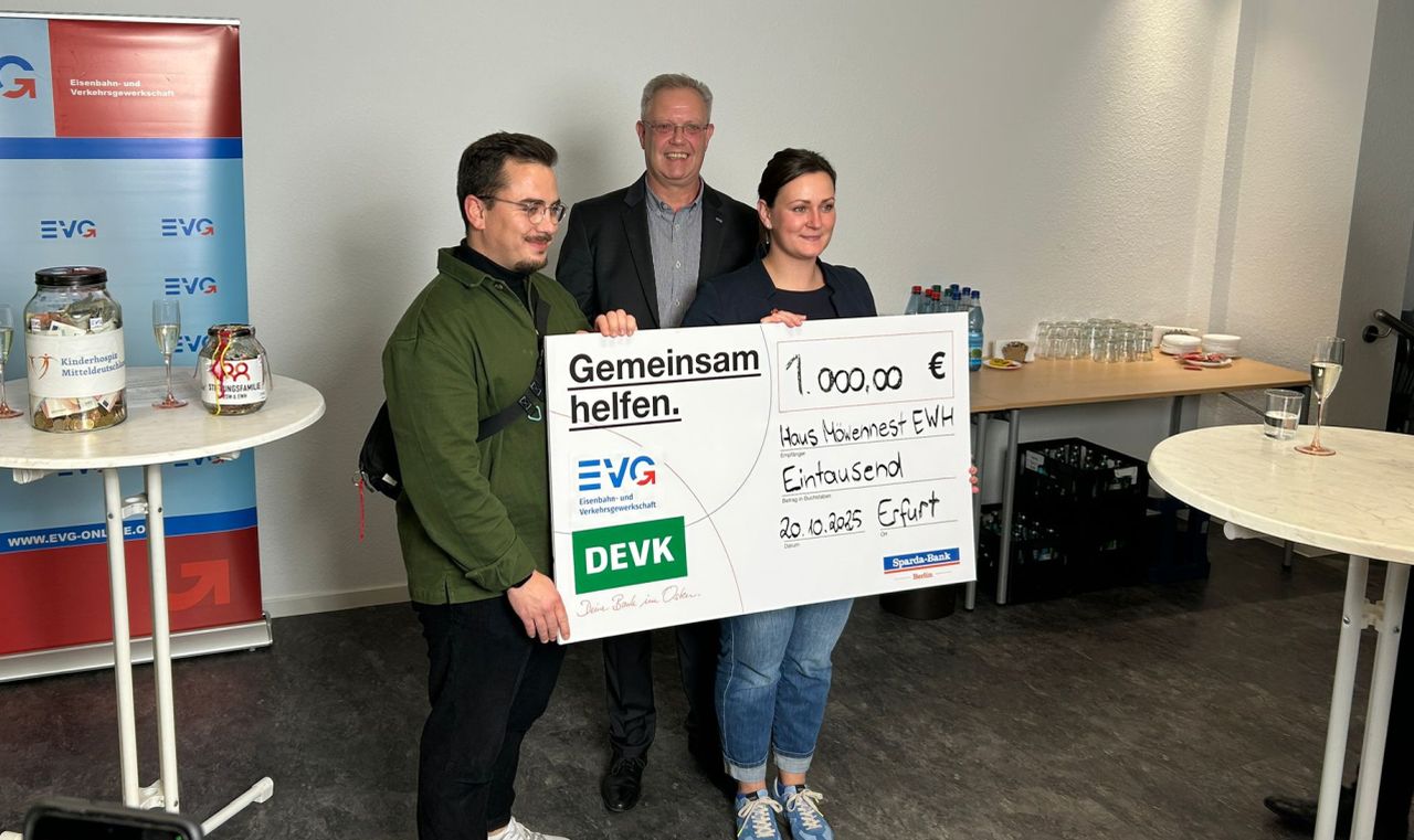 Die EVG Thüringen hat im Rahmen einer landesweiten Spendenaktion 7.023 Euro für soziale Zwecke gesammelt. Der größte Teil - 6.023 Euro - geht an das Kinderhospiz Mitteldeutschland in Tambach-Dietharz, weitere 1.000 Euro erhält das Haus Möwennest der Stiftung EWH auf Usedom.