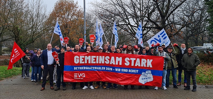Mit einem Signal der Geschlossenheit präsentierte sich die Belegschaft der DB Fahrwegdienste am Montag im Rahmen ihrer Betriebsversammlung in Karlsruhe. Vor dem Veranstaltungsort versammelten sich die Kolleg:innen mit Fahnen und einem Banner, um ihre Unterstützung für den bestehenden Betriebsrat und die bevorstehenden Betriebsratswahlen 2026 zu zeigen.