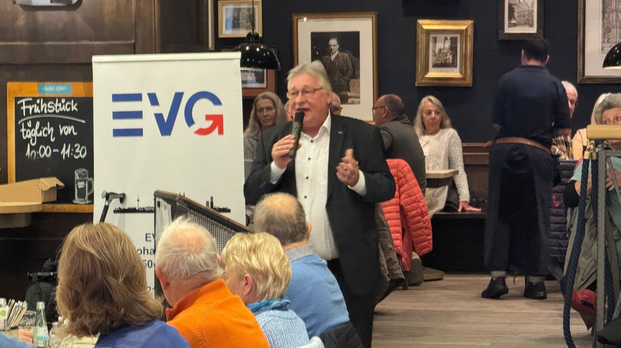 Zusätzlich wurde der Kollege Christian Erbstößer, der aus gesundheitlichen Gründen nicht teilnehmen konnte, für sein 80-jähriges Jubiläum gewürdigt. Das steht exemplarisch für langjährige Treue und Verbundenheit mit der EVG. Die feierliche Laudatio hielt der EVG-Vorsitzende Martin Burkert, der neben dem Dank an die treue Gewerkschaftszugehörigkeit auch auf die aktuelle Bahnpolitik einging.