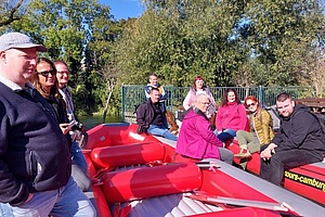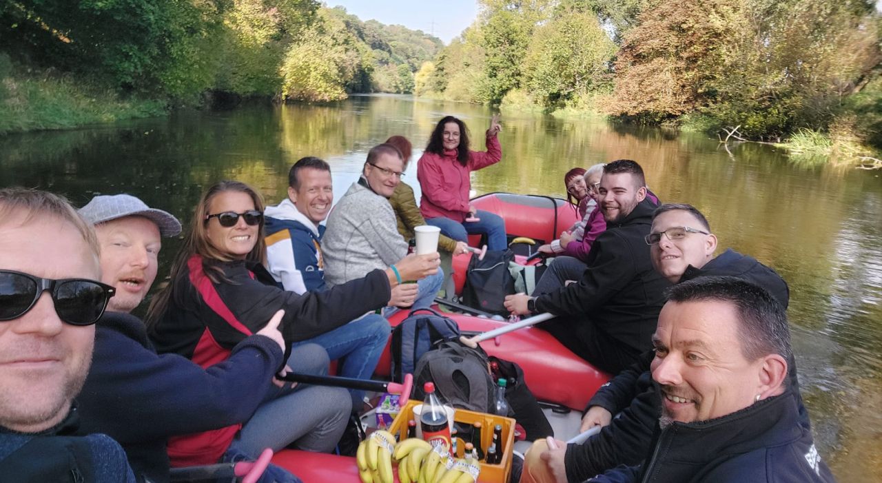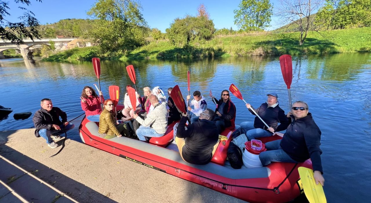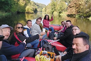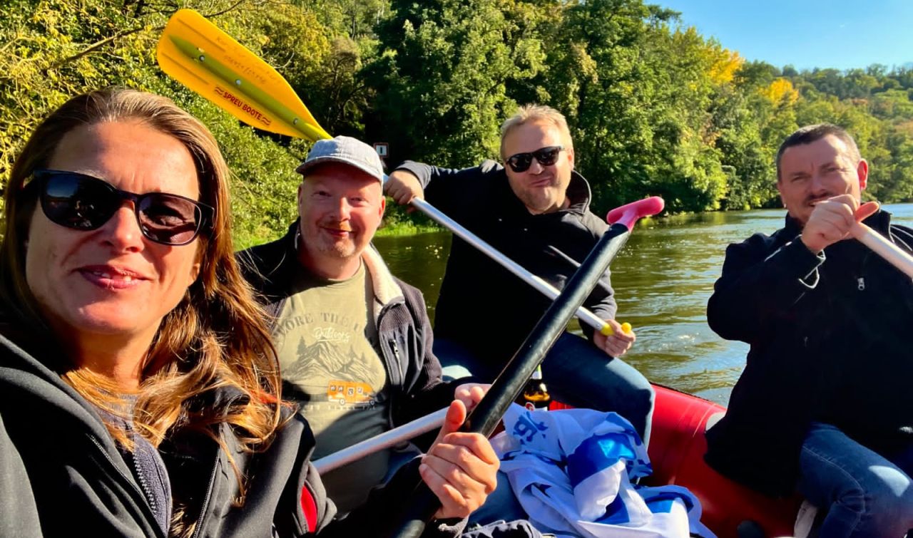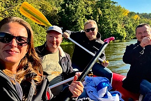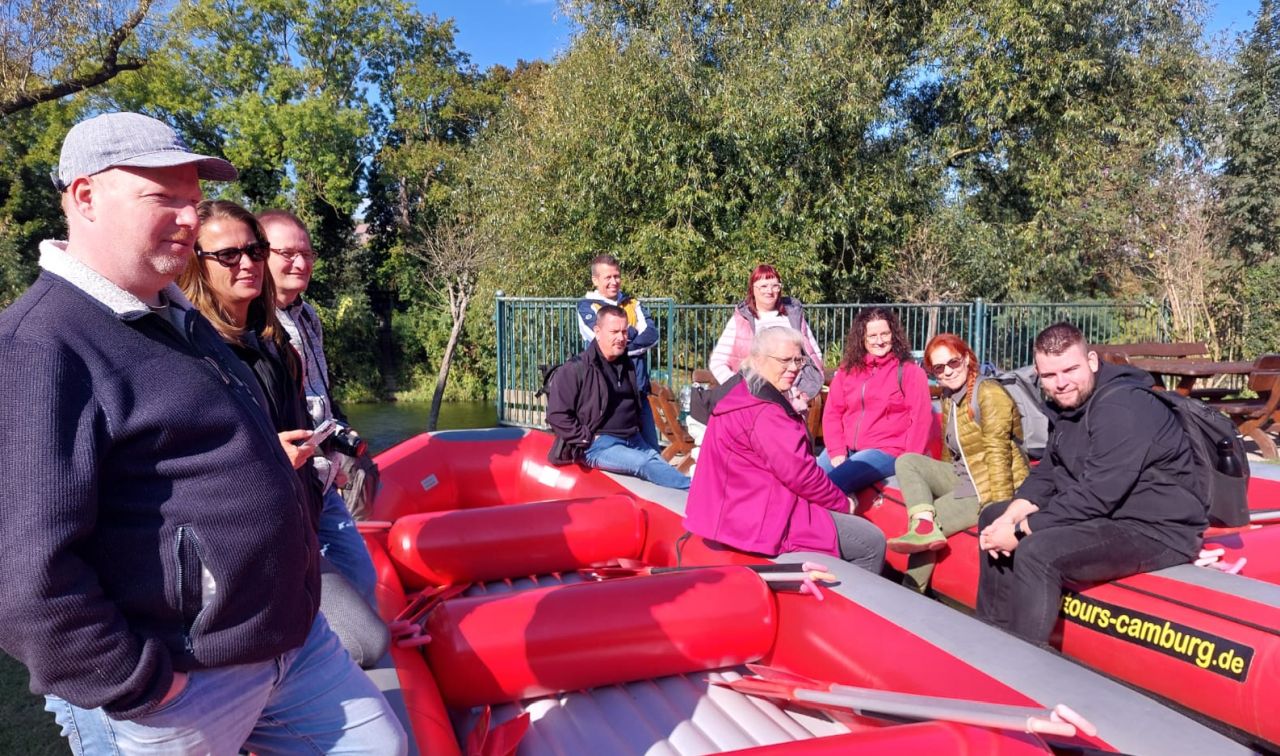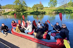 Gemächlich setzte sich das große Schlauchboot in Bewegung. Die Saale glitzerte in der Sonne, das Ufer war gesäumt von Weinbergen, Felsen und bunt gefärbten Wäldern. Immer wieder hallte Lachen über das Wasser, kleine Spritzduelle sorgten für Spaß - und man spürte, wie schnell aus einer bunt gemischten Gruppe ein echtes Team wurde.