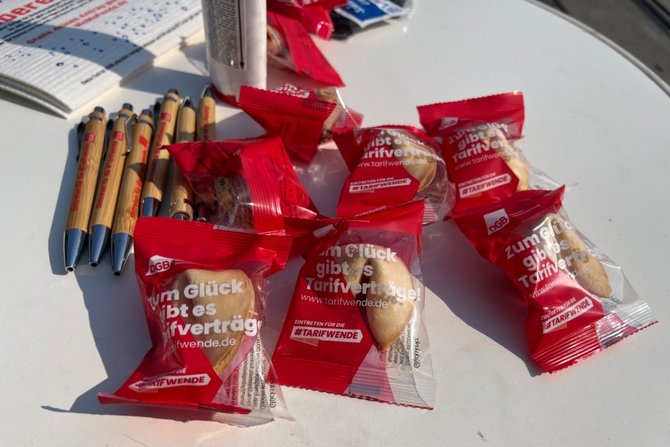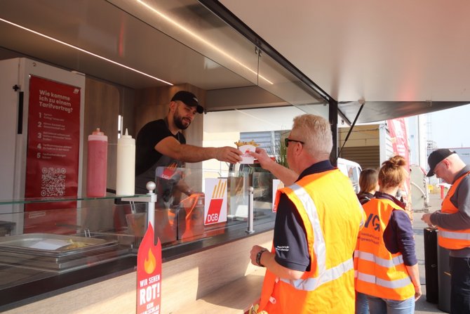 Krosse Krusten, kräftige Kritik: Das DGB-Frittenmobil bei DB Cargo