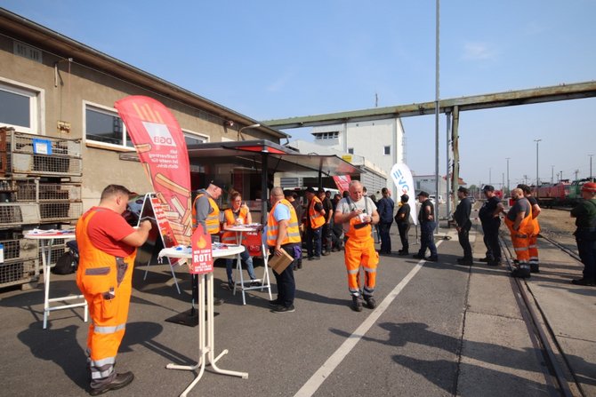 Punkt 12 wird es richtig voll. Die Frühschicht macht Mittagspause. Wir stehen vor der Werkstatthalle bei DB Cargo im brandenburgischen Seddin, einer der großen Zugbildungsanlagen in Deutschland. Schnell bildet sich eine Schlange am „Frittenmobil“, dem Foodtruck des DGB. Auch Sina Alfeld hat schon eine Portion überaus schmackhafter Pommes Frites genossen. Die sind natürlich Bio, mit Schale, in  frischem Öl gebruzzelt. „Ich finde das eine gute Aktion, das ist mal weder was anders. Gut, dass der Sven sich darum kümmert, dass immer was Neues passiert, damit die Leute die Gewerkschaft auch immer wieder live erleben.“