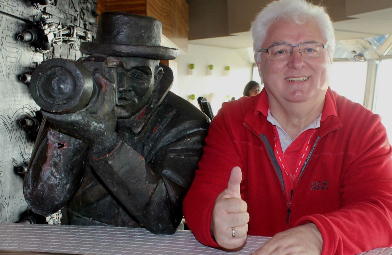 „Die rote Oberbekleidung war mein Markenzeichen und hatte einen pragmatischen Hintergrund“, wie er erläutert. „Ich bin mit dem roten Oberteil wie das Rücklicht am Auto. Ich war immer der letzte Mann der Reisegruppe und mit der roten Farbe für den Reiseleiter immer gut zu erkennen. Sobald ich von hinten dann das Handzeichen gegeben habe, wusste die Stadtführer, dass mit der Führung losgelegt werden kann.“