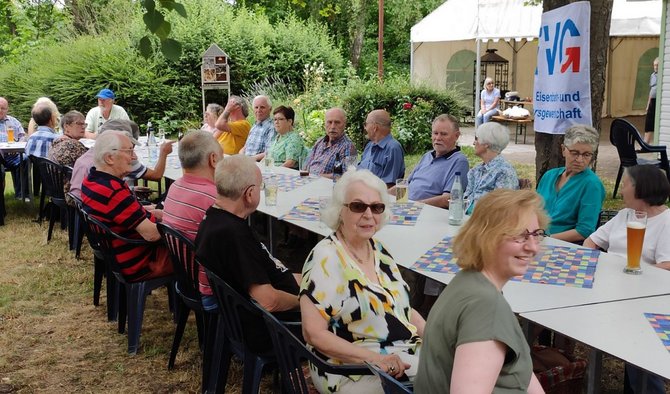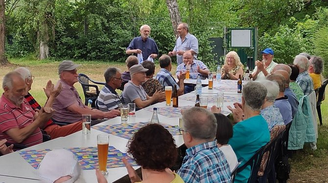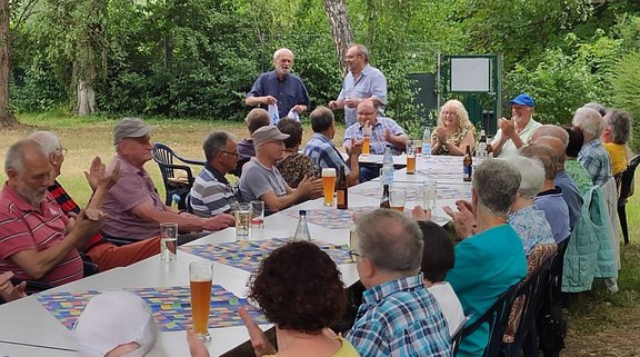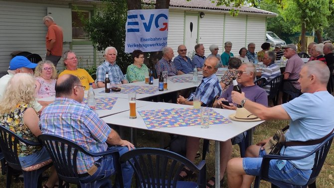 Der Vorsitzende des OV-Vorstandes, Rainer Löbs, kam ebenfalls vorbei und überbrachte die Grüße des Ortsvorstandes. Darüber hinaus berichtete er kurz über die derzeitige Tarifrunde und die anstehende Schlichtung, sowie die Mitgliederentwicklung im Seniorenbereich. Ein besonderes Anliegen war es ihm jedoch, dem Organisationsteam rund um den Ehrenvorsitzenden des Ortsverbandes Rhein-Neckar, Eckhard Schneider seinen Dank für deren Arbeit und Engagement rund um das Grillfest auszudrücken. Obwohl er Geburtstag hatte, ließ es sich Eckhard Schneider auch an diesem Tag nicht nehmen, den Ausschank zu übernehmen. Herzlichen Glückwünsch Eckhard. Gedankt wurde auch an Wolfgang Herrmann, der mit einem Bus, den Shuttle-Service zum Ludwigshafener Hauptbahnhof sicherstellte.
