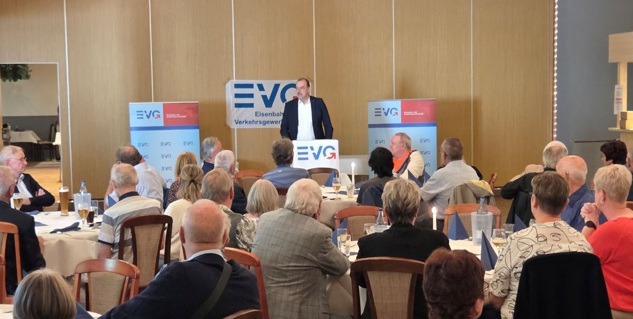 Der OV-Vorsitzende Sven Hitz übergab nach kurzer Begrüßung das Rednerpult an unseren Landesvorsitzenden Niedersachsen, Torsten Rathsmann, der die Festrede hielt. Seine Rede führte uns durch die Eintrittsjahre der Jubilare, weiter über gewerkschaftspolitische Themen, Verkehrspolitik und gesellschaftlichen Herausforderungen unserer Zeit.
