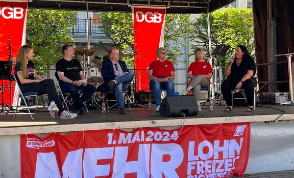 Bei einer Diskussionsrunde zum Thema: „Mehr Lohn, Freizeit und Sicherheit“ mit Henning Foerster, Mitglied des Landtages und EVG-Mitglied, nahm auch die Vorsitzende der Ortsfrauenleitung, Nicole Krull, teil. Neben einem musikalischen Rahmenprogramm fand vor der Bühne eine schöne Kombination aus Politik und Vergnügen auf dem Marktplatz statt, auch für die kleinen Gäste standen spannende Angebote bereit.
