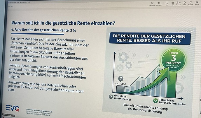 Mit großer Resonanz fand in diesem Jahr die dreiteilige Seminarreihe "Rentenlügen" der EVG und der EVA statt. Ziel war es, weit verbreitete Mythen über die gesetzliche Rente aufzuklären und Sicherheit in einem komplexen Themenfeld zu schaffen, das viele Beschäftigte verunsichern. Die Veranstaltungen wurden getragen von Expert:innen der Deutschen Rentenversicherung Bund sowie von Samuel Beuttler-Bohn, Gewerkschaftssekretär und Rentenexperte der Abteilung Sozialpolitik und Teilhabe im Vorstandsbereich Cosima Ingenschay. Gemeinsam räumten sie mit Unsicherheiten auf - faktenbasiert, verständlich und nah an den Fragen der Mitglieder.