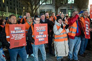 Sicherheit sei nicht verhandelbar, machte deshalb der stellvertretende EVG-Vorsitzende Kristian Loroch auf der Demonstration vor dem Tagungshotel deutlich. Dort wurden die Teilnehmenden des Branchentreffs des Bundesverbands SchienenNahverkehr mit Protestplakaten empfangen. „Wir erwarten mehr qualifiziertes Sicherheitspersonal, Bodycams und Doppelbesetzung im Schienenpersonennahverkehr, aber auch bei den Bussen“, betonte er. Die „Zeit von Sonntagsreden und warmen Worten“ sei vorbei. Nun seien die Aufgabenträger in der Pflicht. Wer jetzt nicht handele, mache sich mitschuldig, so Kristian Loroch.