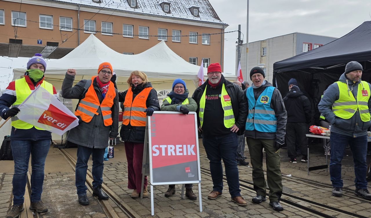 Trotz eisiger Kälte stehen die Kolleginnen und Kollegen stabil vor den Toren. Bis Dienstagmorgen ruht der Bus- und Straßenbahnverkehr in Halle. Der Streik ist ein notwendiges Zeichen, um die Forderungen von über 150.000 Beschäftigten bundesweit durchzusetzen.