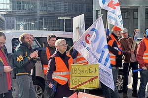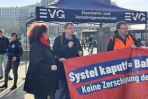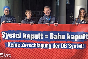 Vor dem Hintergrund der laufenden Umbaupläne bei der Deutschen Bahn protestierten am Morgen 160 Eisenbahnerinnen und Eisenbahner gegen die Zerschlagung der DB Systel sowie gegen den Abbau von Arbeitsplätzen. Anlass ist ein für heute geplantes Spitzengespräch mit dem Konzernvorstand, den Betriebsräten und der EVG zur Zukunft von Systel, Services und der DB Holding.