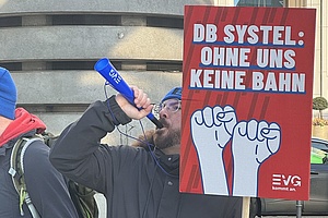 Unter dem Slogan „Wir alle sind Eisenbahn“ demonstrierten die Teilnehmenden den engen Schulterschluss der Eisenbahnerfamilie. So waren neben Caner Cengiz, GBR Vorsitzender von DB Services, auch Betriebsräte aus der DB Holding vertreten. Ricarda Schilling, stellvertretende Vorsitzende der EVG Betriebsgruppe Systel in Frankfurt, las weitere Unterstützungsnachrichten vor - unter anderem von FZI und Regio.