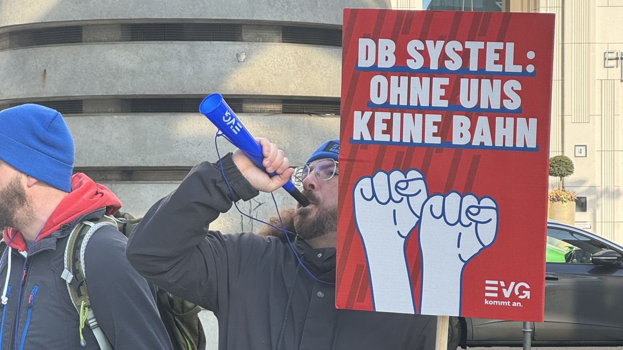 Zur Kundgebung aufgerufen hatten die EVG Betriebsgruppen der DB Systel aus Berlin, Erfurt und Frankfurt, die bereits vor zwei Wochen Hunderte Kolleg:innen mobilisieren konnten. EVG-Vize Kristian Loroch stellte drei zentrale Ziele der EVG für die Gespräche heraus: „Erstens müssen wir die Zerschlagung von Systel vom Tisch bekommen. Zweitens brauchen wir eine gute Lösung für die Kolleg:innen der Services – sie müssen endlich raus aus der Mindestlohnfalle. Und drittens dürfen die Beschäftigten in der Holding nicht planlos von A nach B geschubst werden.“