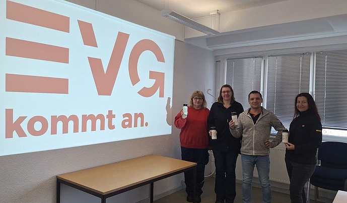 Als Zeichen der Anerkennung erhielt jede Kollegin einen Thermobecher mit einer klaren Ansage: „Ohne EVG ist alles blöd.“ Die Aktion kam bei den Frauen im Werk gut an und sorgte während der Schicht für viele Gespräche und ein Lächeln.