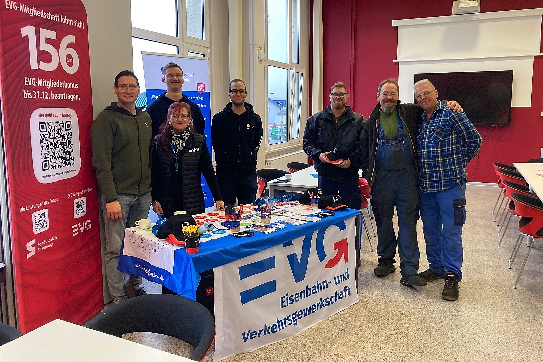Die Kolleg:innen informierten sich über aktuelle Entwicklungen und tauschten Erfahrungen sowie Erwartungen aus. Trotz eines ungeplanten "Wasserausfalls" im Sozialgebäude, der dazu führte, dass einige Beschäftigte im Homeoffice arbeiteten, blieb die Stimmung positiv. Besonders im Fokus stand auch der tarifliche Mitgliederbonus der EVG: 468 Euro, der seit Mai beantragt werden kann und als Erholungsbeihilfe durch den Fonds soziale Sicherung (FsS) ausgezahlt wird.