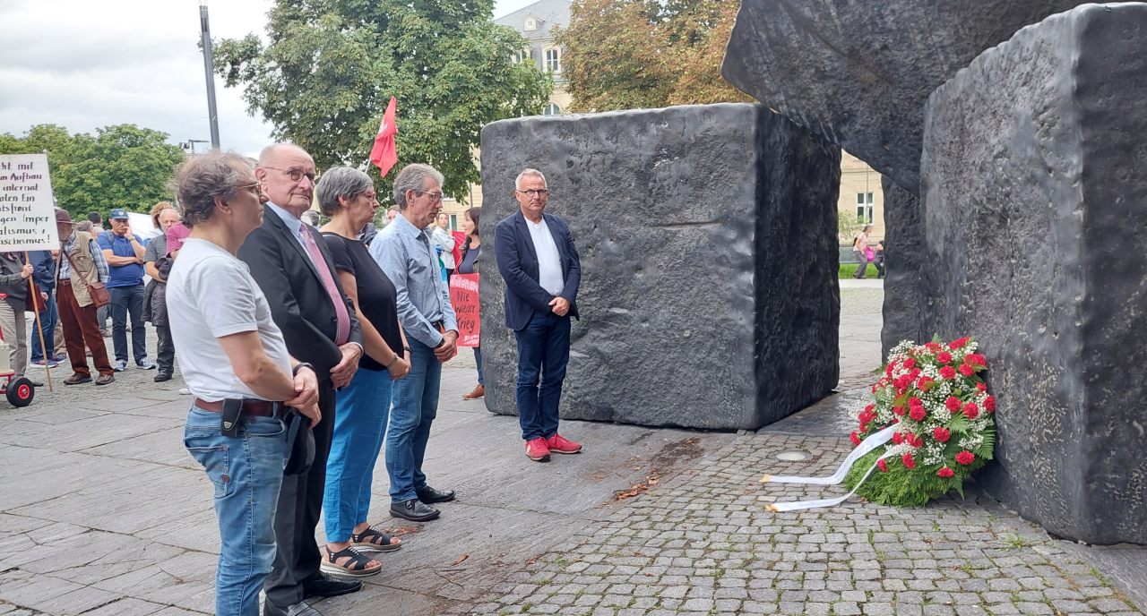 Begleitet wurde das Programm durch Musik von Michael Hecht. Vor der Kranzniederlegung am Mahnmal für die Opfer des Nationalsozialismus sangen wir gemeinsam das Lied „Die Moorsoldaten“ im Andenken an alle Opfer von Verfolgung und Krieg. In der Region Stuttgart fanden auch noch weitere Veranstaltungen anlässlich des Antikriegstages statt, zum Beispiel in Esslingen, Böblingen, Fellbach und Ludwigsburg statt.