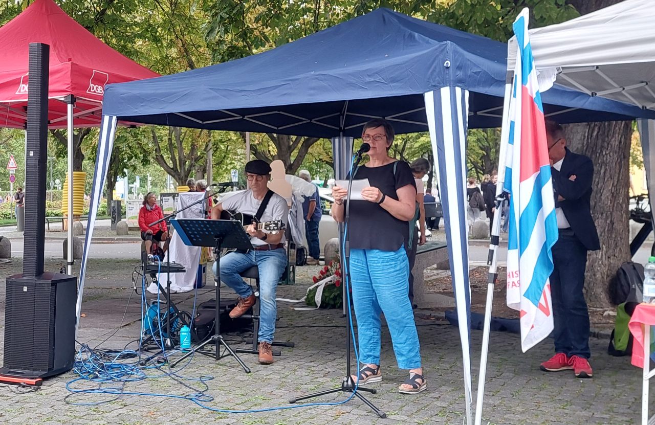 Erinnert wurde dabei an die Verfolgung und Ermordung von Menschen durch die Nazis, eindrücklich vorgetragen durch z.B. Gudrun Greth, Mitglied des VVN-BdA. Und wie aktuell wichtig es ist, die Rüstungs- und Gewaltspirale überall auf der Welt zu durchbrechen, wo sich ein Konflikt an den anderen reiht. Besonders der Krieg in der Ukraine, unter dem am meisten die zivile Bevölkerung zu leiden hat und weltweit das Problem der Verknappung und Verteuerung von Nahrungsmitteln noch verschärft.