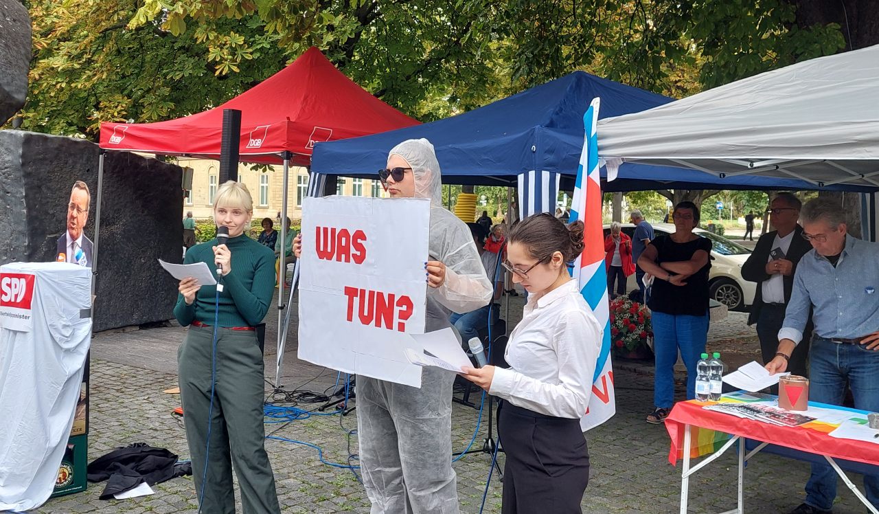 Die AfD zum Beispiel kann da sicher keine Alternative sein, sondern wird die Probleme in der Gesellschaft hinsichtlich Teilhabe, Gleichstellung und Verteilungsgerechtigkeit nur verschärfen. Begleitet wurde die Kundgebung durch eine kleine Performance junger Vertreter:innen des OTKM (Offenes Treffen gegen Krieg und Militarisierung) Stuttgart. Die Vorsitzende der EVG-Frauen Stuttgart und zugleich Vorsitzende des Stadtverbandes der DGB-Frauen Stuttgart, Christina Rendler, trug ein Antikriegsgedicht vor.