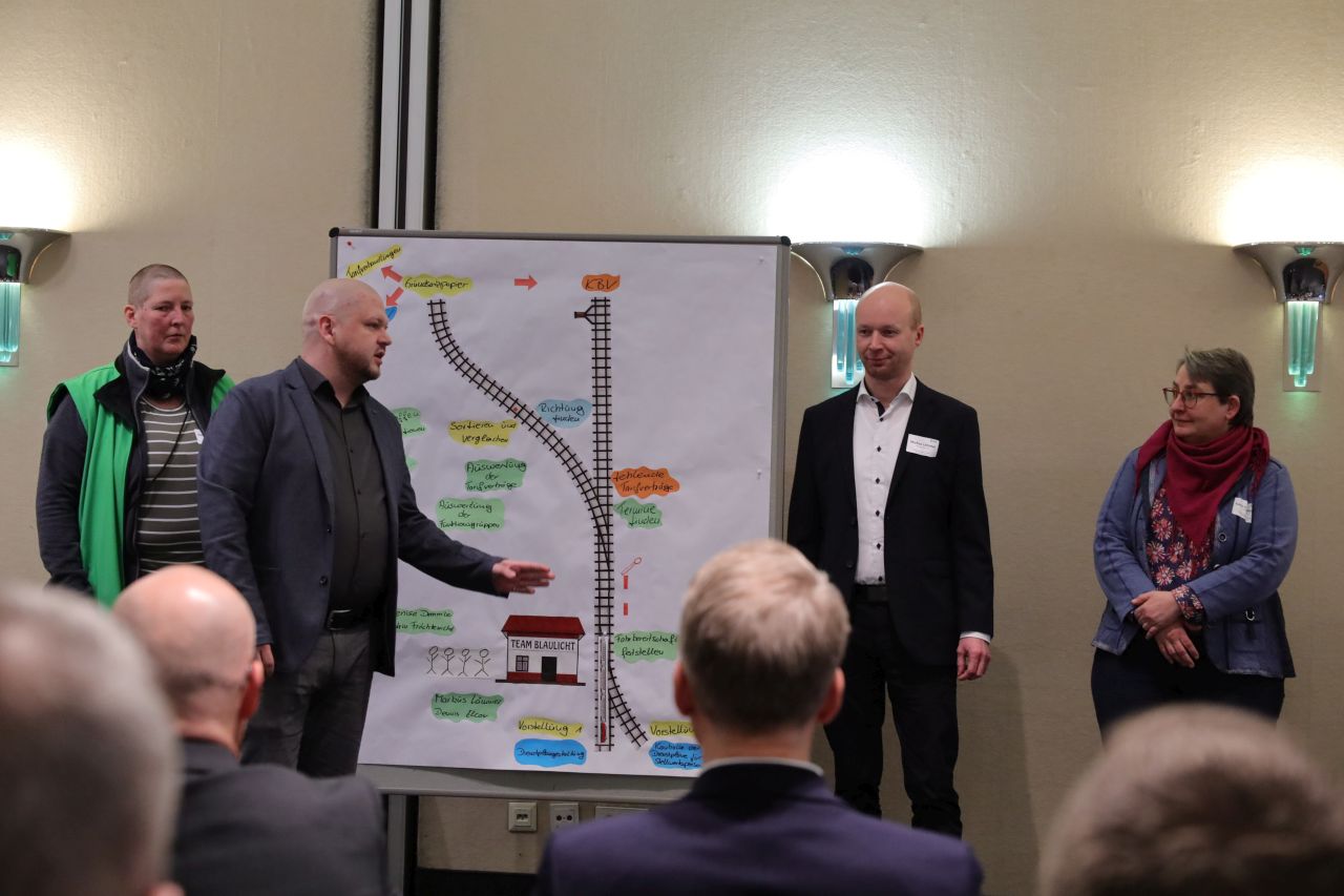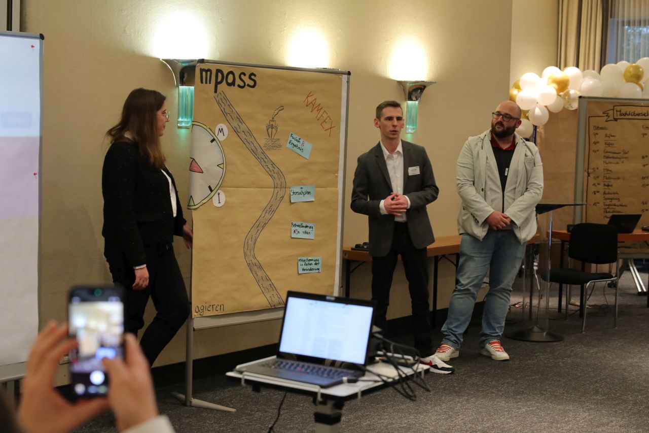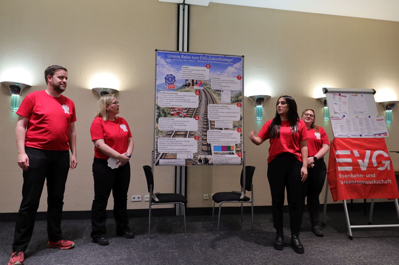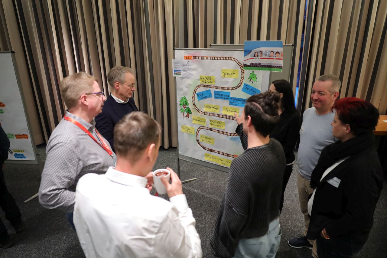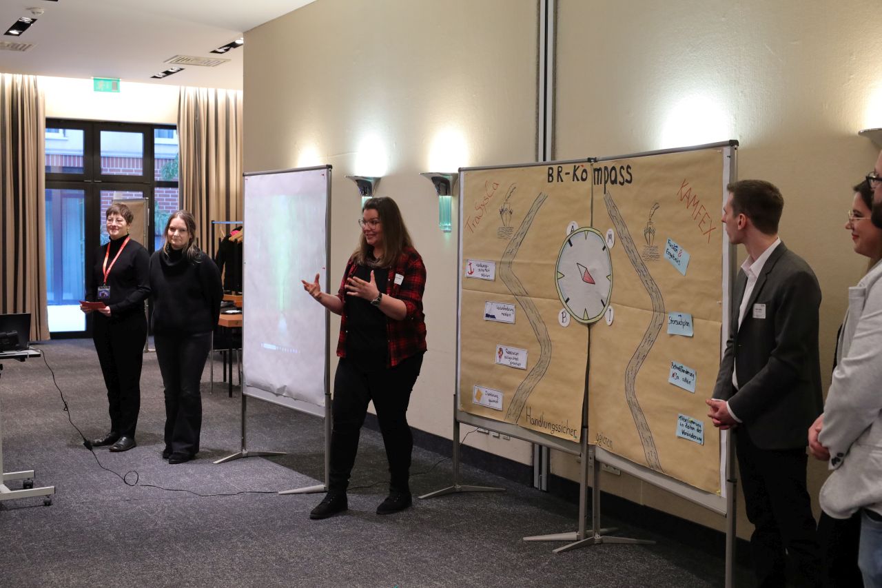 Zwei Gruppen - ein ähnlicher Gedanke – am Ende ein gemeinsames Projekt. Die Gruppe Kamfex (so benannt nach den Initialen der Mitglieder) befasste sich mit „Mitbestimmung in Zeiten der Veränderung“ und hier konkret mit der Frage „Was können wir tun, um unser Expert:innen-Wissen weiterzugeben?“ Das kreuzte sich bald mit den Wegen ener weiteren Projektgruppe, die eine „Erste-Hilfe-Toolbox“ für Betriebsräte entwickelte, um die laufenden Geschäfte eines BR-Gremiums mit den aktuellen Veränderungen im DB-Konzern zu vereinbaren. So entstand in Gemeinschaftsarbeit der „Betriebsratskompass“, der Handlungsempfehlungen zum Umgang mit personellen Maßnahmen zusammenstellt. Fazit der Teams: „Schon durch unsere Projektarbeit sind wir selbst handlungssicherer geworden. Und wir haben festgestellt, dass es gut und vorteilhaft ist, geschäftsfeldübergreifen zusammenzuarbeiten.“