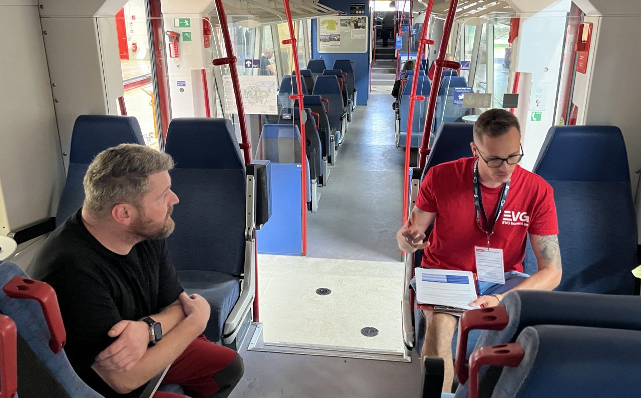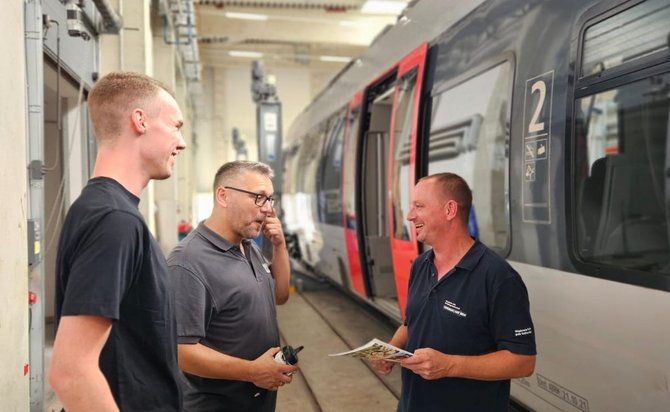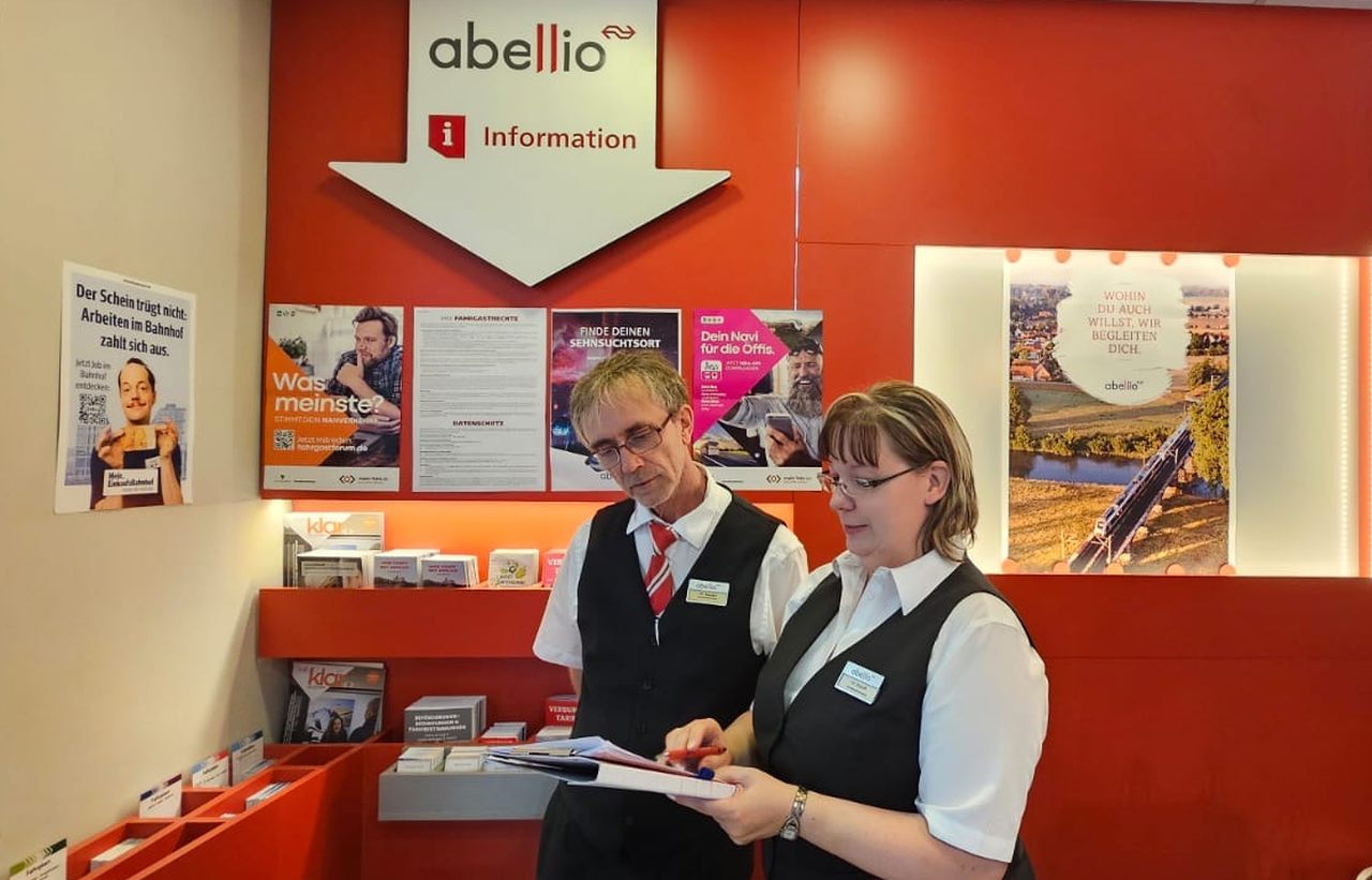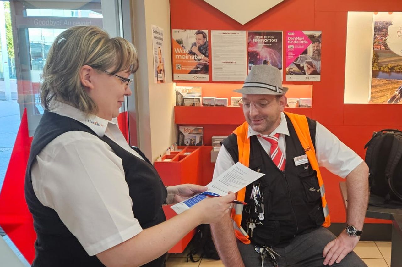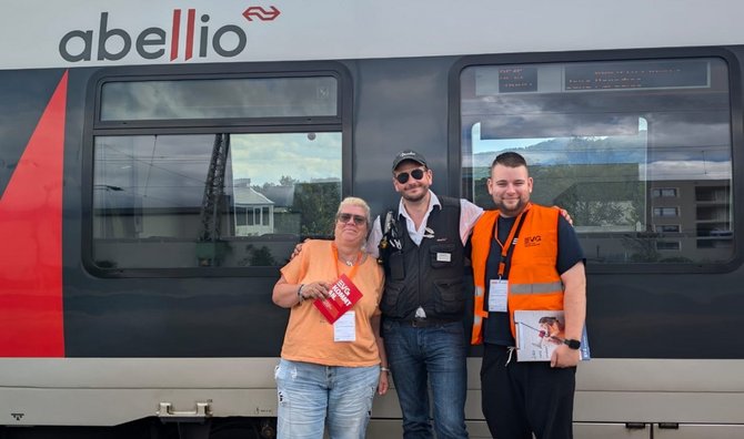 Die Tour wurde in der Woche unter anderem bei Abellio an den Standorten Halle (Verwaltung und Hauptbahnhof), Sangerhausen (Werkstatt), Naumburg, Saalfeld und Erfurt fortgesetzt. Dabei haben wir Kolleg:innen aus allen Bereichen befragt: Lokführer:innen, Zugbegleiter:innen, Mitarbeitende im Kundencenter, in der Werkstatt und in der Verwaltung. Ein großes Dankeschön an alle, die sich die Zeit genommen haben, uns ihre Meinung mitzuteilen.