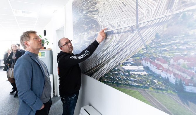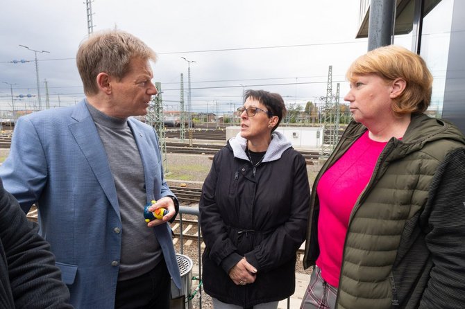 Danach besuchte er das Stellwerk der DB Netz AG. Hier warteten bereits Annett Nordmann (OV Eisleben und Betriebsrätin DB Netz Halle) und David Dvořák (Vorsitzender OV Halle) auf ihn. Vor Ort konnte er miterleben, dass nur einer von zwei Fahrdienstleisterposten besetzt war. Genau diese Problematik der fehlenden Kolleg:innen hat Annett mit ihm besprechen können, auch die Schwierigkeiten der Praxistests für die Quereinsteiger.