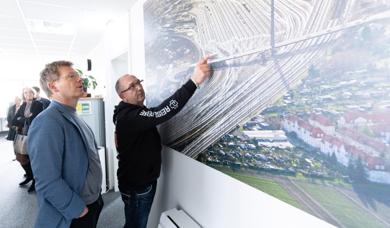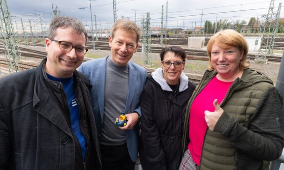 Er startete mit einem Rundgang am Hauptbahnhof und besuchte die Kolleg:innen der DB Station & Service. Anschließend ging es zu DB Cargo in einen offenen Austausch mit den Kolleg:innen und sie stellten ihm die Zugbildungsanlage vor.
