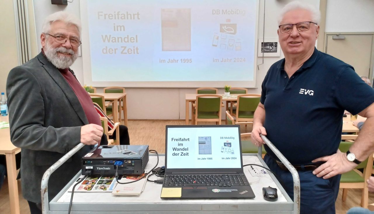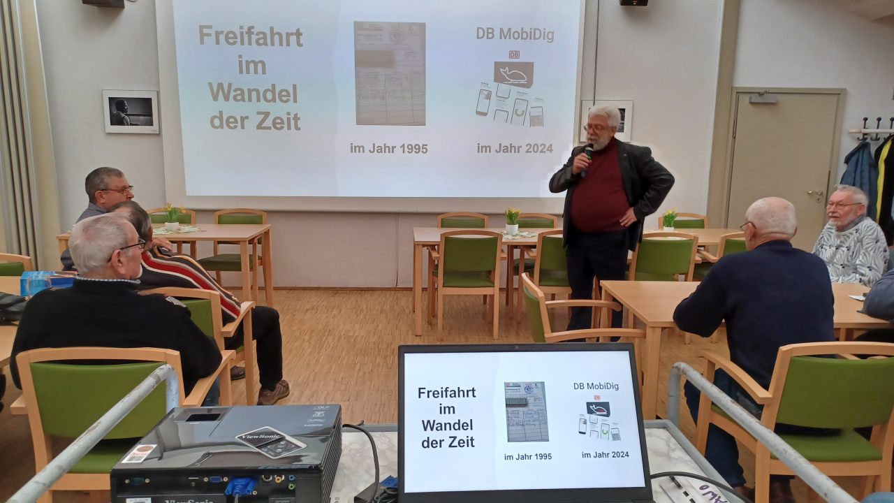 Der Vorsitzende der OSL, Harald Schmid, hatte als Referent den ehemaligen Geschäftsführer der EVG-Vermögensverwaltungsgesellschaft und Abteilungsleiter Finanzen, Controlling und Mitgliederverwaltung in der EVG-Zentrale in Frankfurt, Anton Hofmann, eingeladen. Hofmann schilderte in seinem Einführungsvortrag „Schritt für Schritt“ die Installation der DB App auf das Smartphone und zeigte den Anwendern:innen die Vorteile, wie sich die Freifahrtberechtigten Eisenbahner:innen den Weg zum Automaten am Bahnhof - sofern überhaupt noch vorhanden - ersparen können.