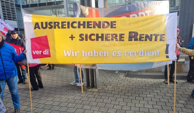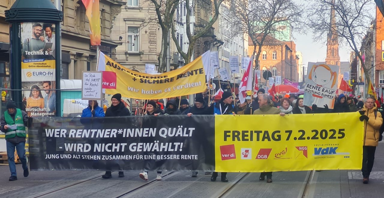 Veranstaltet worden ist die Aktion von einem breiten Bündnis, darunter ver.di, der Sozialverband VdK, der Deutsche Gewerkschaftsbund (DGB), die Gewerkschaft Erziehung und Wissenschaft (GEW), der Direktversicherungsgeschädigte e.V. (DVG), die Gewerkschaft Nahrung-Genuss-Gaststätten (NGG), die Arbeiterwohlfahrt (AWO) und viele weitere Organisationen. Teile des Ortsverbandsvorstandes der EVG in Karlsruhe waren mit dabei!