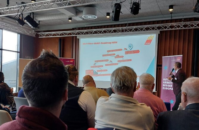 Bulut stellte dann die Terminschiene für die Kampagne #Tarifwende NRW vor. Nach einer Pressekonferenz und einer Osterverteilaktion in den Regionen, gibt es eine Einladung zur Audienz „Masterplan Tarifbindung NRW“ an den Minister Laumann geben. Und vom 17.05 bis 03.06.2024 gibt es die Fritten-Mobil-Aktionswoche durch die Regionen NRW (Region MEO/Niederrhein 23.05.2024). Den Abschluss bildet dann der Pendleraktionstag am 18.09.2024.