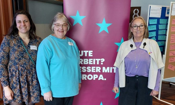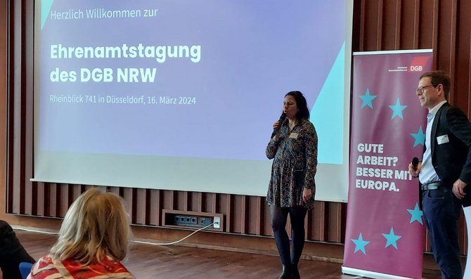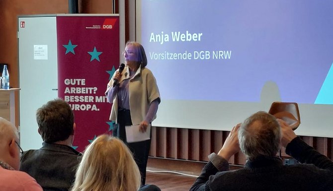 Dann übergab sie an Tanja Bergrath, Leiterin der DGB Verbindungsstelle in Brüssel. Neben Tanja sind noch zwei weitere Kollegen:innen in Brüssel beschäftigt. In Brüssel vertritt die DGB-Verbindungsstelle Europapolitik die Interessen des DGB und seiner Mitgliedsgewerkschaften gegenüber den europäischen Institutionen. Man arbeitet eng im Bündnis mit dem Europäischen Gewerkschaftsbund und den in Brüssel vertretenden nationalen gewerkschaftlichen Dachverbänden sowie anderen Organisationen der Zivilgesellschaft zusammen.