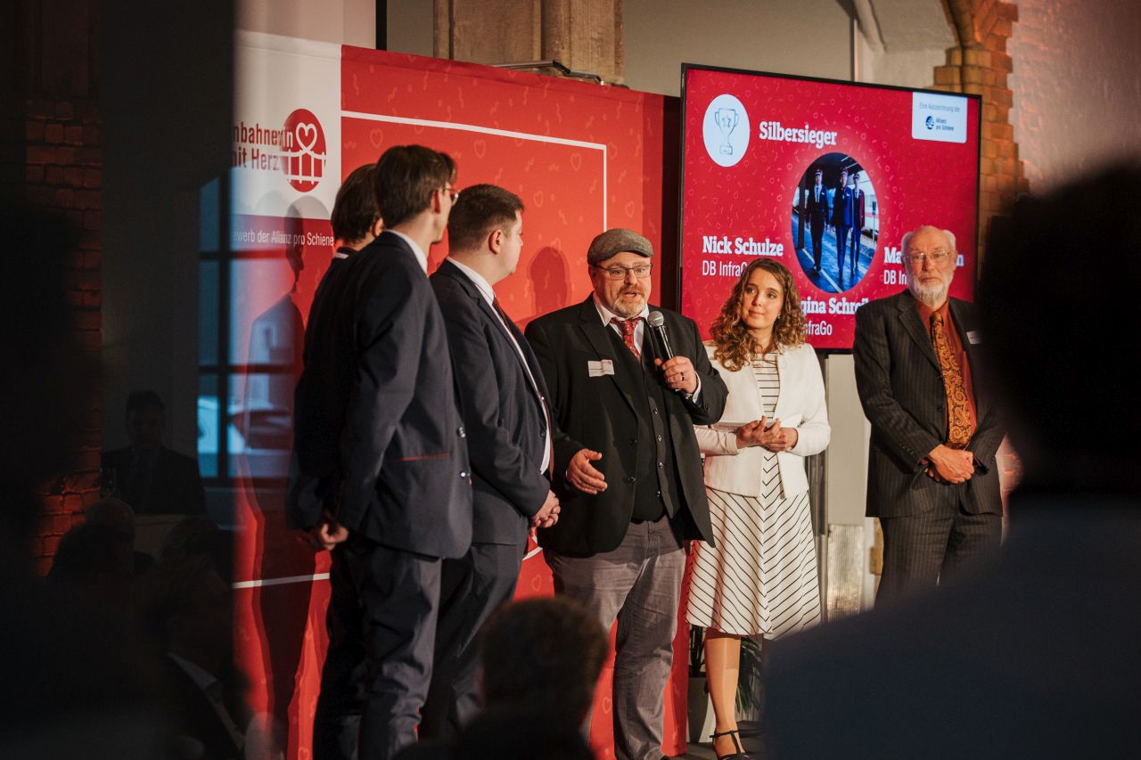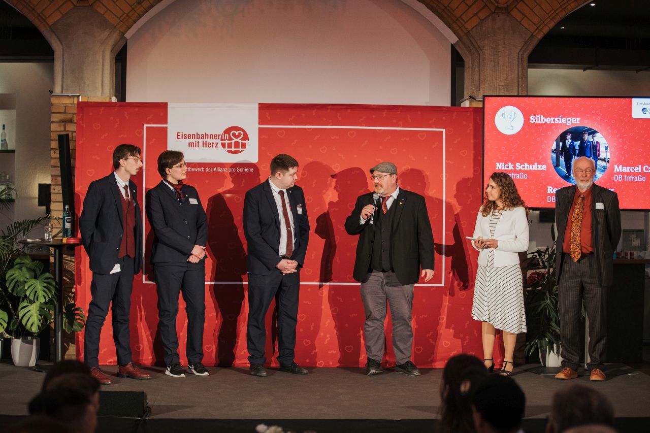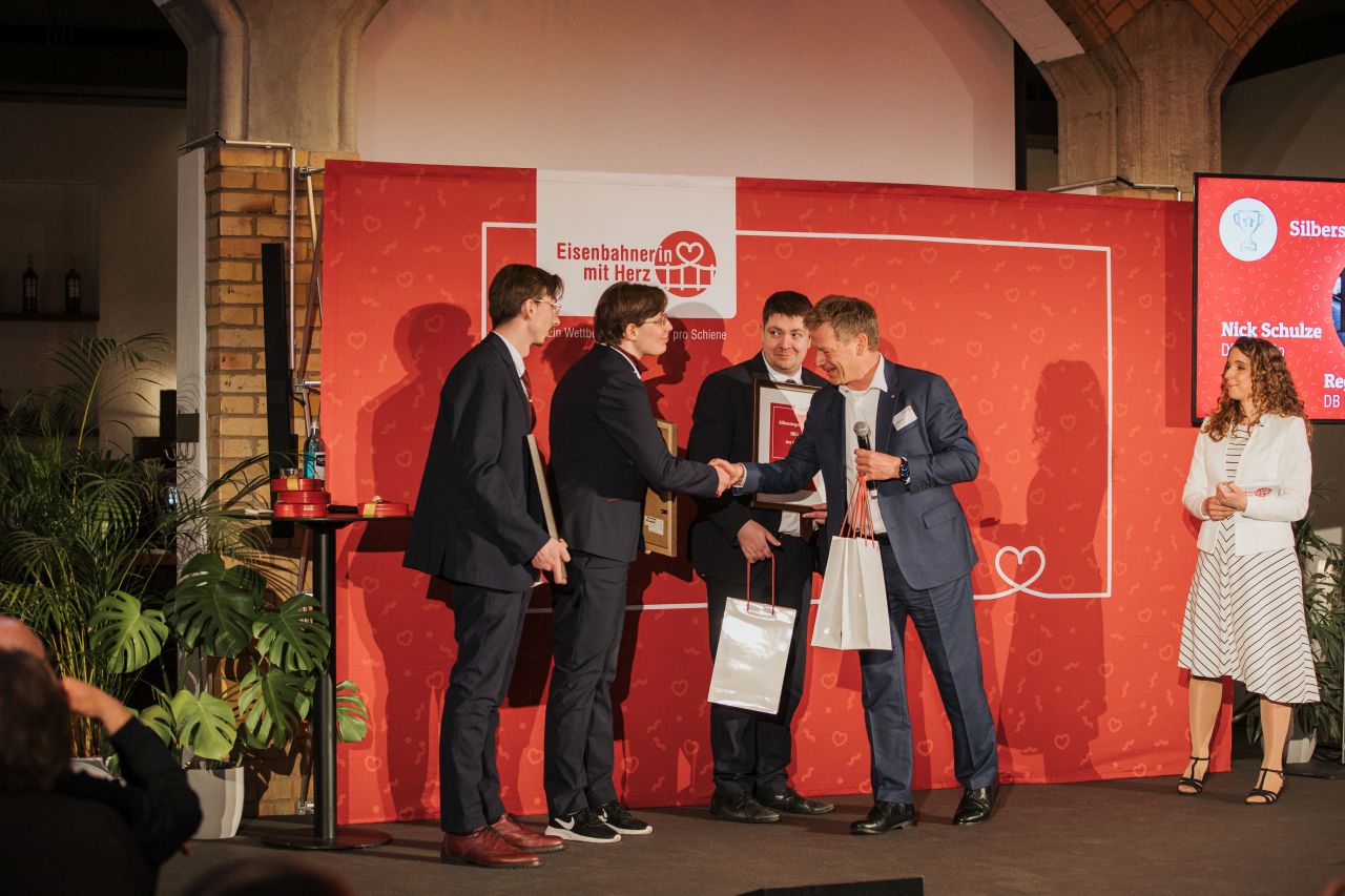 Marcel Czubin, Regina Schreiber und Nick Schulze von der DB InfraGO AG am Düsseldorfer Hauptbahnhof wurden mit Silber ausgezeichnet. An einem chaotischen Tag im März 2024 sorgte das Trio gemeinsam mit weiteren Kolleginnen und Kollegen dafür, dass eine mobilitätseingeschränkte Reisende trotz überfüllter Bahnsteige und eines Notfalleinsatzes sicher und pünktlich ihre Heimreise antreten konnte. Mit perfektem Zusammenspiel, viel Eigeninitiative und einem klaren Blick für das Wesentliche, ermöglichten sie einen reibungslosen Umstieg in den ICE - ganz ohne Reservierung.