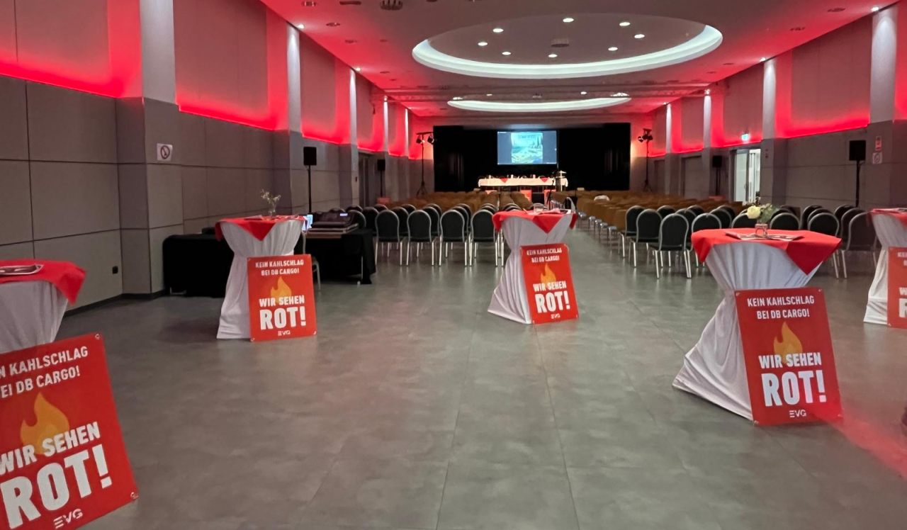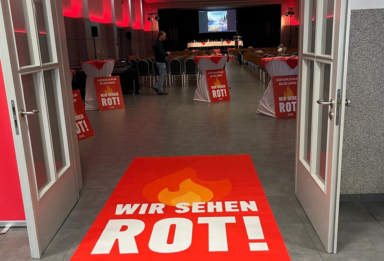 Mit Licht, Bannern, Plakaten und roten Teppichen machten die Teilnehmenden Betriebsgruppenmitglieder auf der Teil-Betriebsversammlung der DB Cargo Hagen in den Zentralhallen Hamm am Donnerstag deutlich: „Wir sehen rot!". Anlass war der anhaltende Widerstand gegen die Kahlschlag-Pläne bei DB Cargo und die geplante Transformation des Unternehmens.