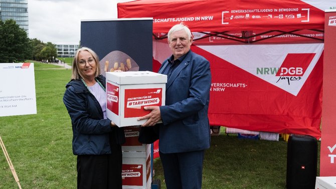 Landtag in Düsseldorf: Anja Weber vom DGB NRW und die Vertreter/innen der Mitgliedsgewerkschaften überreichen dem Arbeitsminister Karl-Josef Laumann ca. 7000 unterschriebene Postkarten und fordern die Umsetzung des Tariftreuegesetzes in NRW.