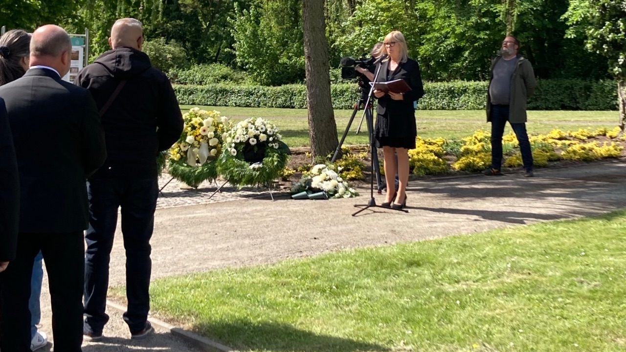 Oberbürgermeisterin Simone Borris und der Landesvorsitzende des Volksbundes, Rüdiger Erben, erinnerten in ihren Ansprachen an das unfassbare Leid, das durch Krieg, Gewalt und Diktatur verursacht wurde. Die Vizepräsidentin des Landtages, Anne-Marie Keding, sprach das traditionelle Totengedenken. Auf dem „Feld der Vereinten Nationen“ auf dem Westerhüsener Friedhof ruhen 926 Opfer des Zweiten Weltkrieges aus 11 Nationen.