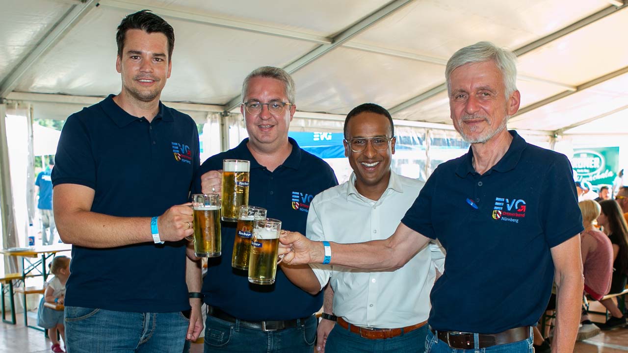Ortsverbandsvorsitzender Ingbert Hautsch von DB Regio begrüßte alle Gäste und zeigte sich stolz, was die Teilnehmerzahl und die positive Resonanz auf dieses erste Sommerfest des Ortsverbands Nürnberg betraf. Die Grüße der Stadt Nürnberg überbrachte Stadtrat Nasser Ahmed, SPD-Vorsitzender in Nürnberg, und betonte die Wichtigkeit der Eisenbahner für den Standort Nürnberg. Der ebenfalls anwesende EVG-Vorstand Frank Hauenstein zeigte sich erfreut über so viele teilnehmende Eisenbahnerinnen und Eisenbahner und ging auf die Erfolge der Gewerkschaft in den vergangenen Jahren ein. Daran knüpfte zuletzt Geschäftsstellenleiter Matthias Birkmann an und verwies stolz darauf, dass Nürnberg bei den EVG organisierten Eisenbahnerinnen und Eisenbahnern weiterwächst und bundesweit den Spitzenplatz beim Organisationsgrad aller Geschäftsstellen einnimmt.