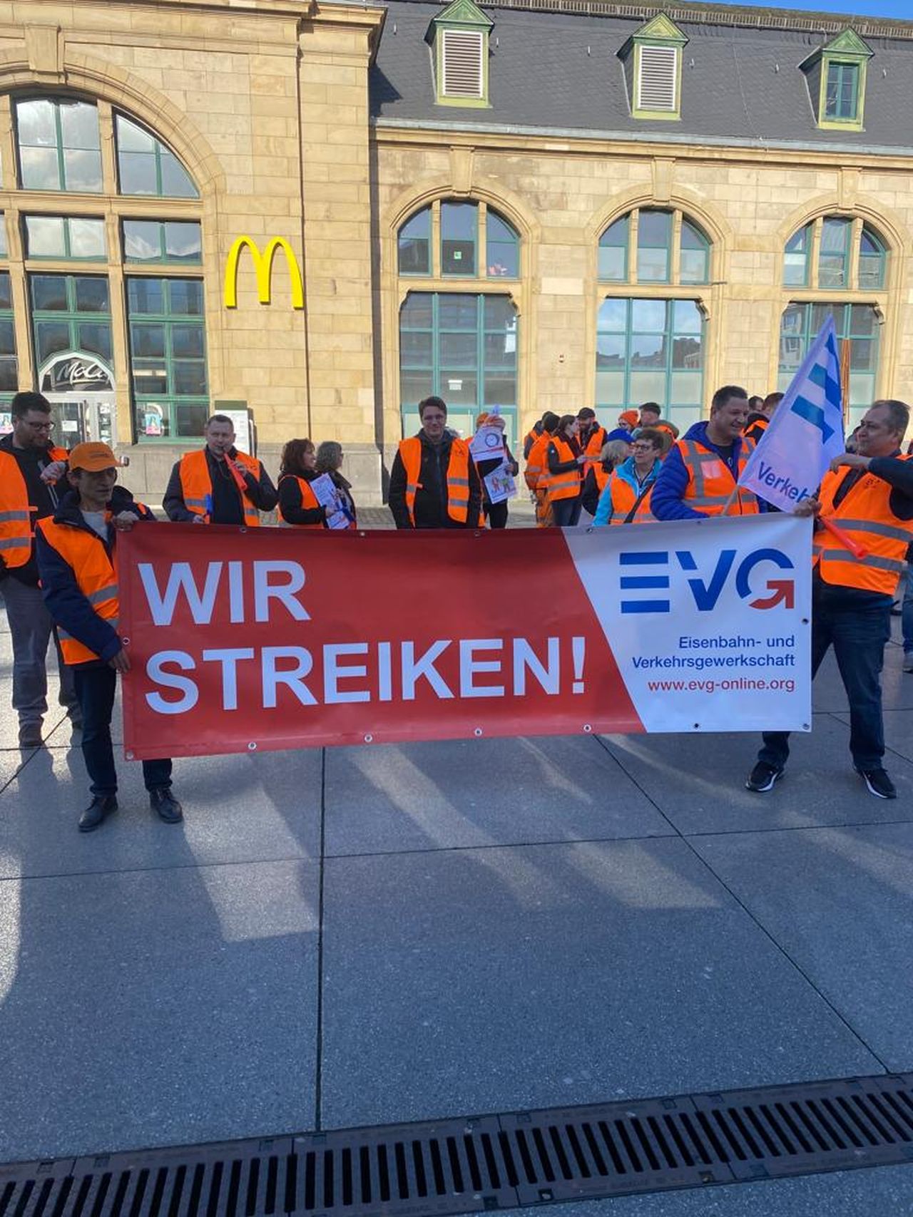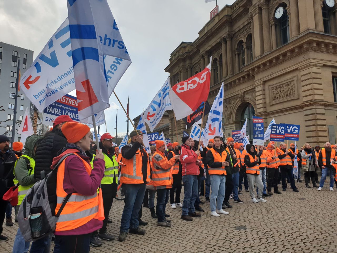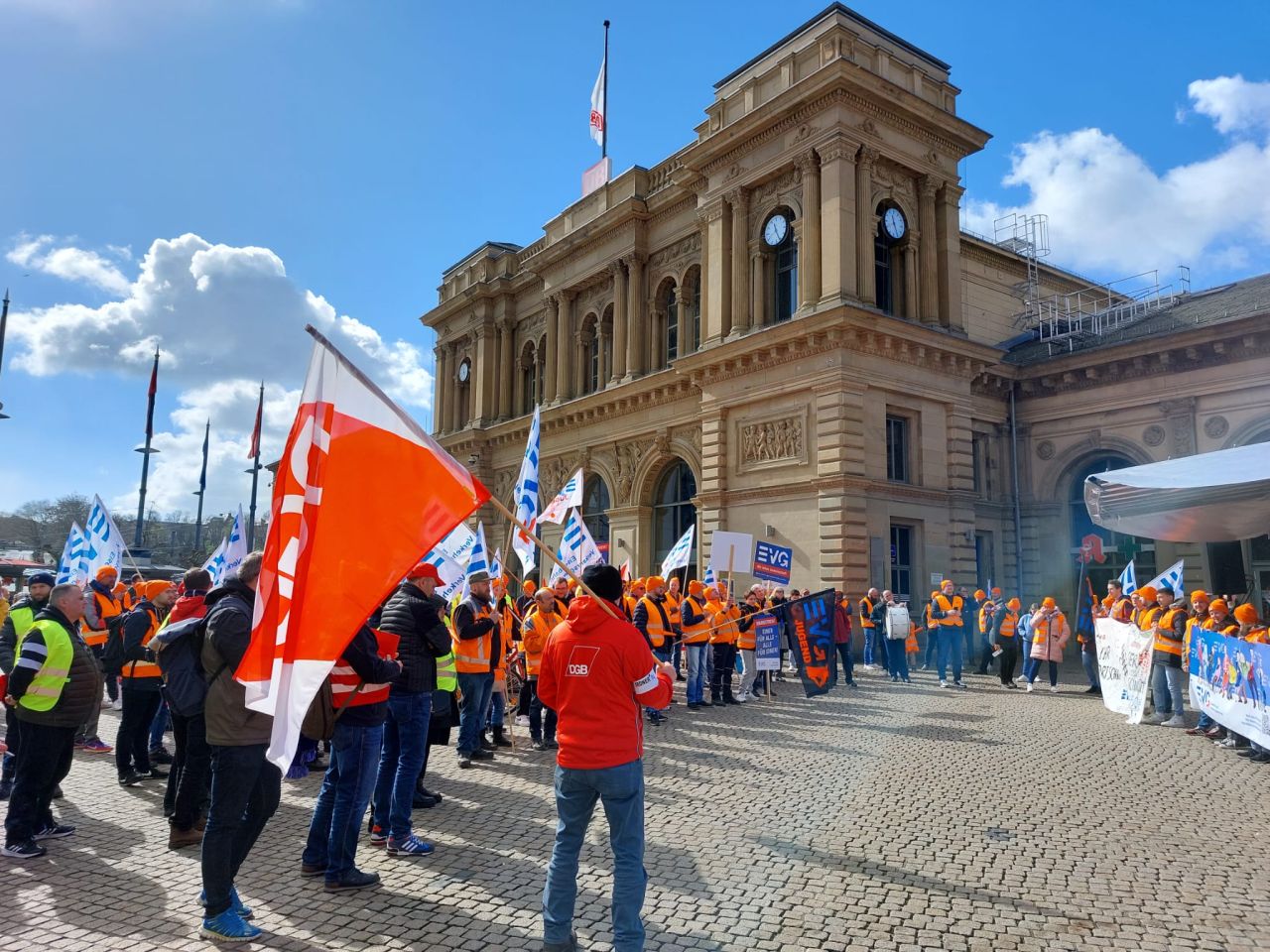 Dass unsere Mitglieder somit quasi von zuhause aus streiken konnten, war besonders gut, denn „ein Zugverkehr war ab 00:00 Uhr Zeigersprung nirgends mehr möglich“ so unser Geschäftsstellenleiter Lars Kreer. Bundesweit war der Streik zusammen mit unserer Schwestergewerkschaft ver.di koordiniert. In Mainz schlossen sich die Streikenden jeder Gewerkschaft nach zwei eigenen Demonstrationen durch die Landeshauptstadt vor dem Bahnhof zum gemeinsamen Streik zusammen.