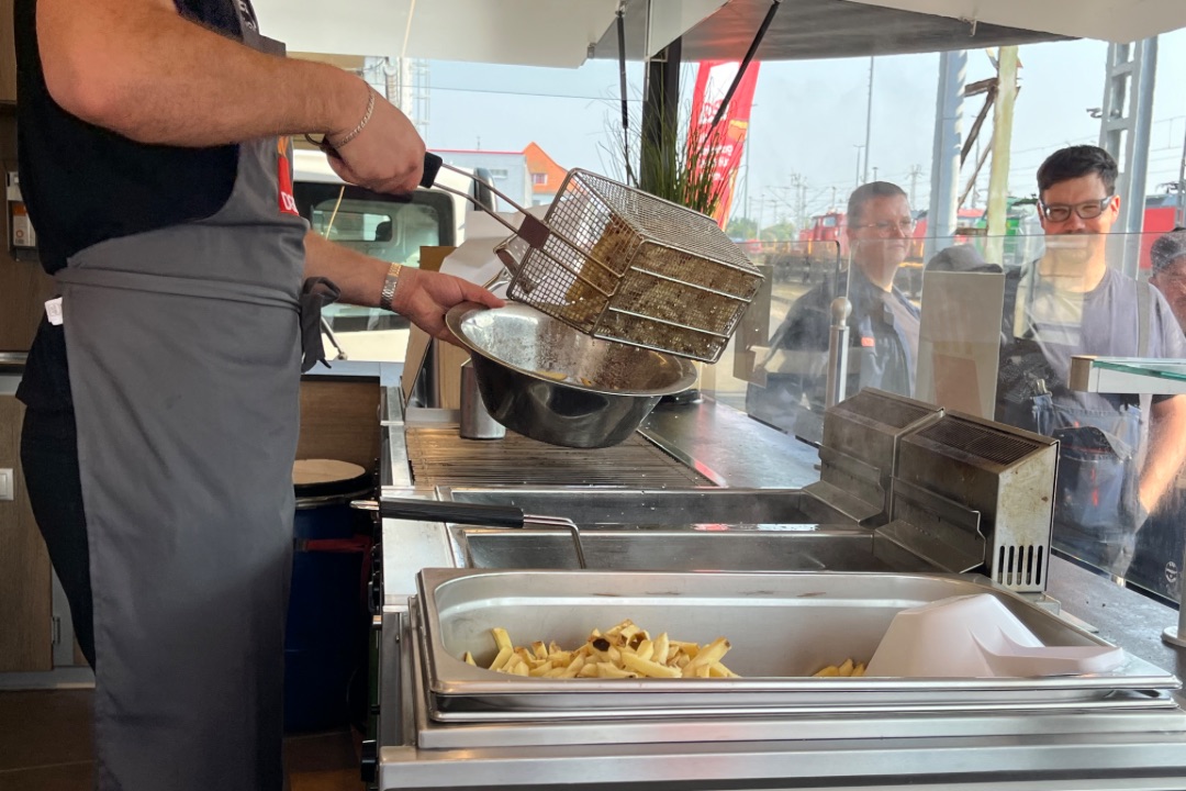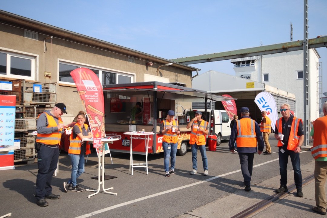 Der so Gelobte winkt ab. „Wir sind zweimal im Jahr mit dem BG-Grill hier und verköstigen die Kollegen mit Currywürsten“, sagt der Betriebsgruppenvorsitzende Sven Schüler. „Als das Angebot vom DGB kam, mit dem Frittenmobil zu kommen, haben wir das gerne angenommen. Das bedeutet noch mehr Zeit für uns, mit den Kolleg:innen ins Gespräch zu kommen, und das ist der eigentliche Sinn dieser Tage.“ Bei einem Flächenbetrieb mit Standorten von der Ostsee bis fast nach Sachsen-Anhalt „werden wir es nie schaffen, alle Mitglieder zu einer zentralen Versammlung zusammen zu bekommen. Deswegen machen wir es umgekehrt: Wir gehen zu den Leuten. So lernen sii uns kennen und das schätzen sie auch.“