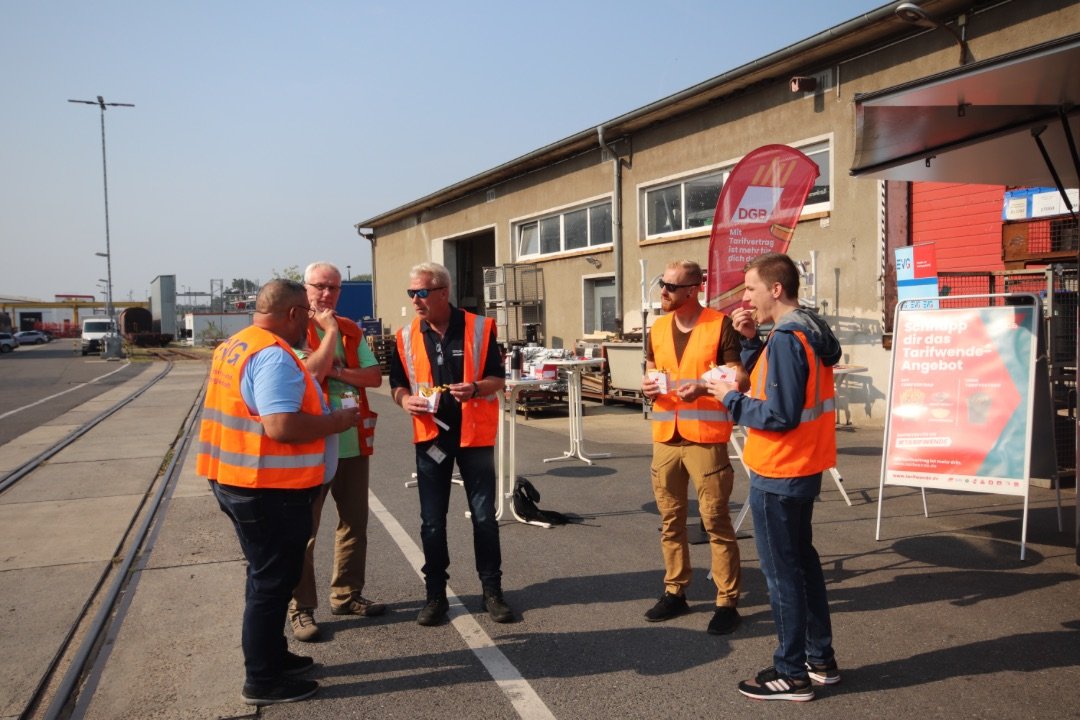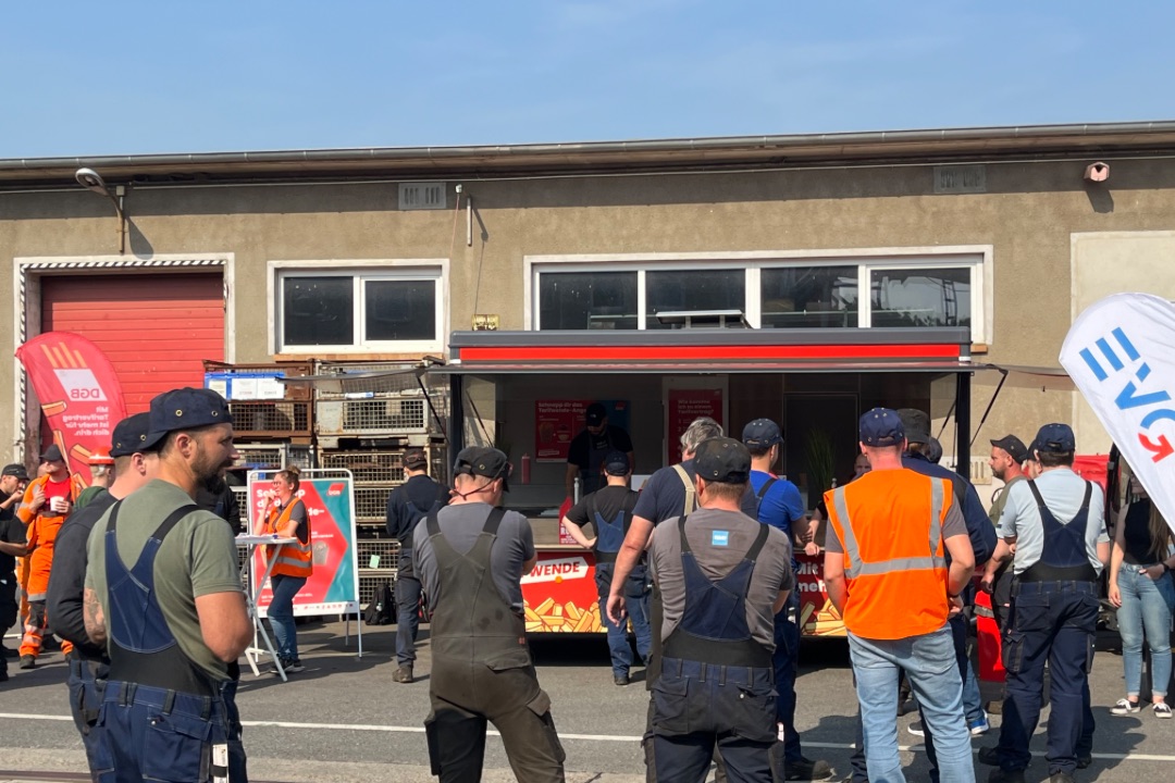 Punkt 12 wird es richtig voll. Die Frühschicht macht Mittagspause. Wir stehen vor der Werkstatthalle bei DB Cargo im brandenburgischen Seddin, einer der großen Zugbildungsanlagen in Deutschland. Schnell bildet sich eine Schlange am „Frittenmobil“, dem Foodtruck des DGB. Auch Sina Alfeld hat schon eine Portion überaus schmackhafter Pommes Frites genossen. Die sind natürlich Bio, mit Schale, in frischem Öl gebruzzelt. „Ich finde das eine gute Aktion, das ist mal weder was anders. Gut, dass der Sven sich darum kümmert, dass immer was Neues passiert, damit die Leute die Gewerkschaft auch immer wieder live erleben.“