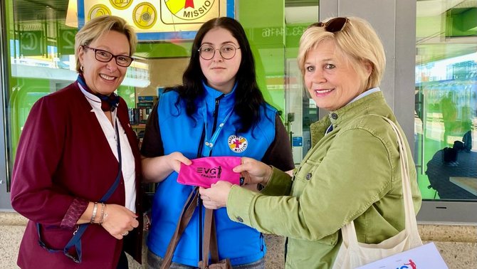 Neben einer Geldspende haben die EVG-Landesfrauen - vertreten durch Birgit Ziegler und Christa Goebel - die restlichen Nougat Waffelschnitten der Bahnhofsmission Saarbrücken überreicht.